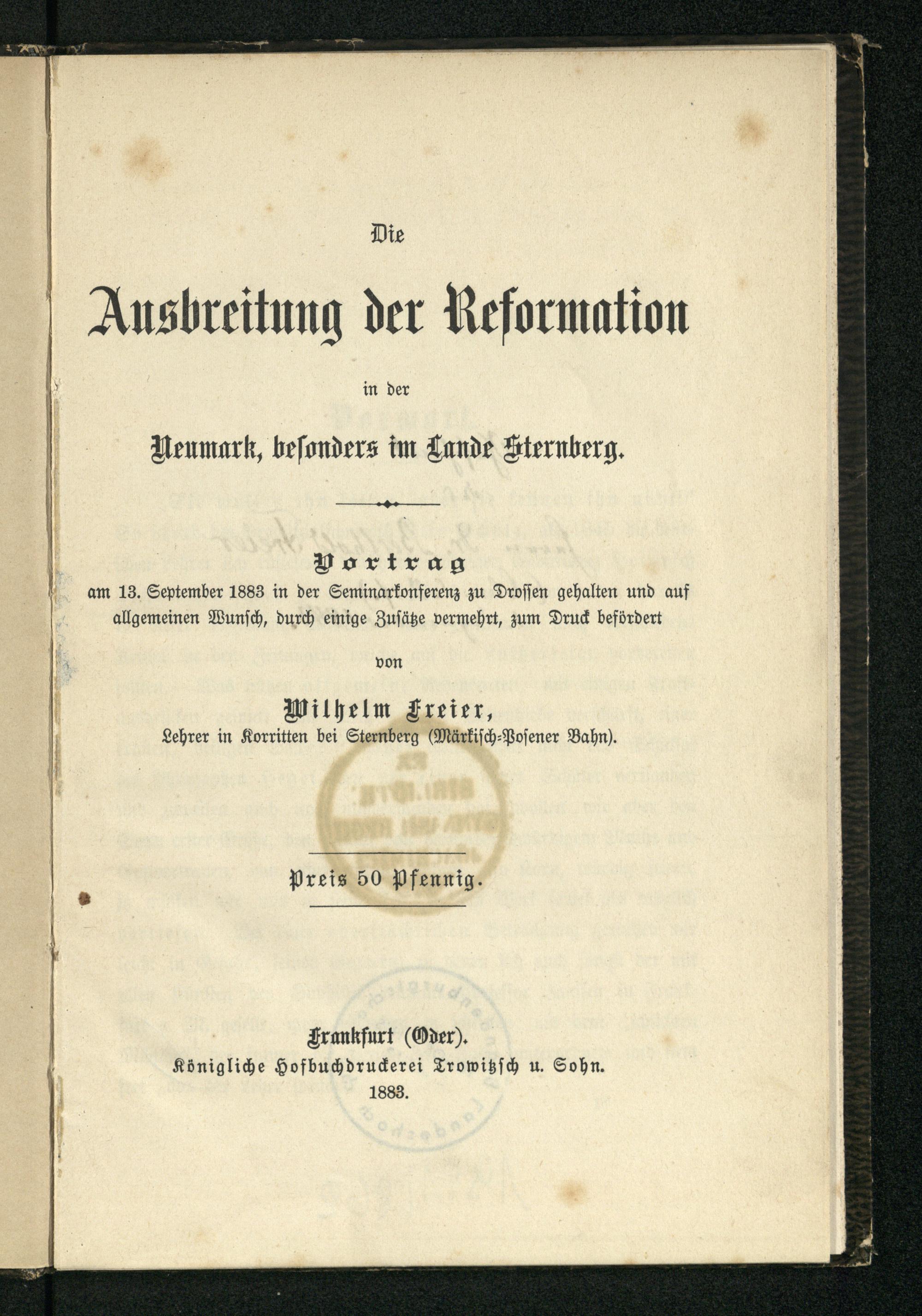Die Ausbreitung der Reformation in der Neumark, besonders im Lande Sternberg / Vortrag von Wilhelm Freier