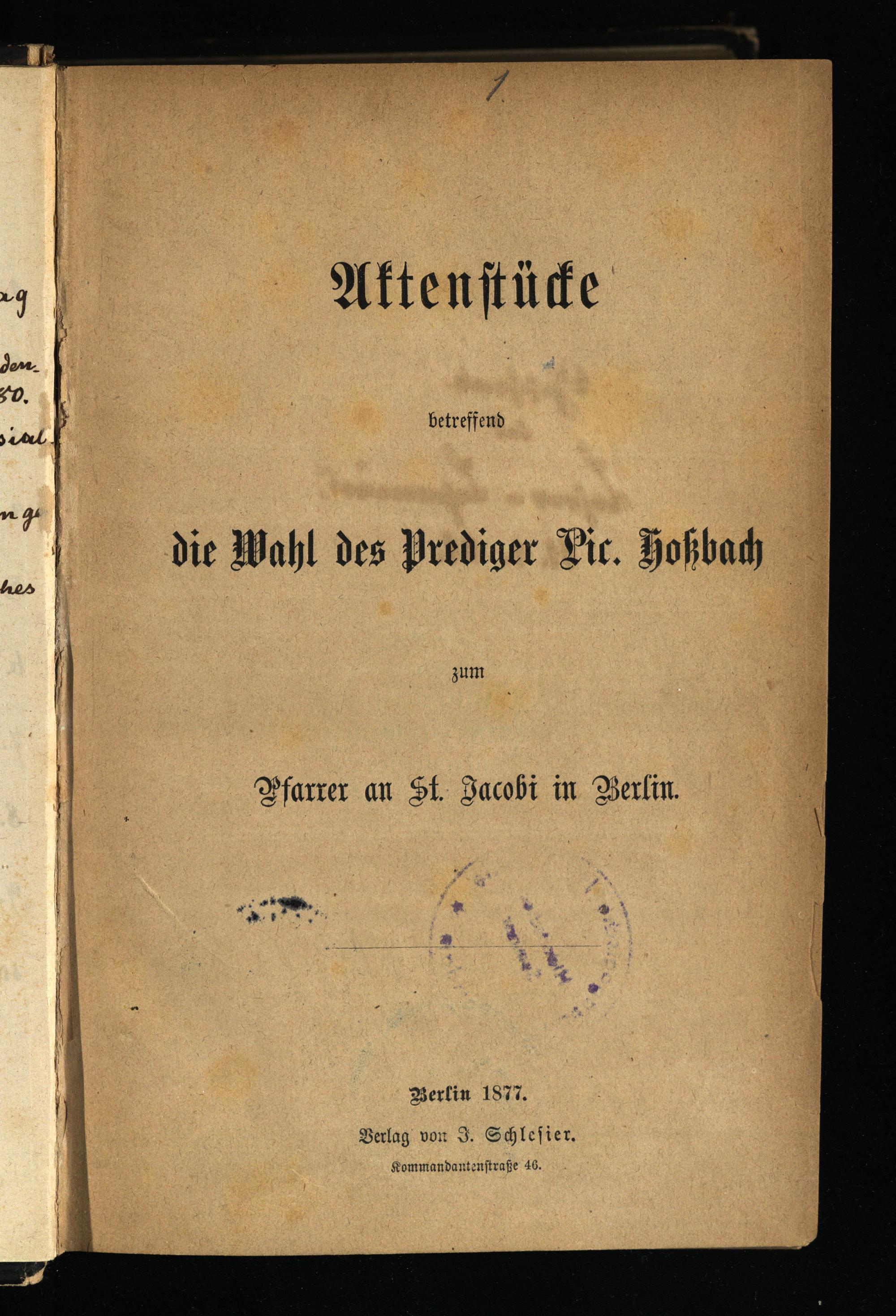 Aktenstücke betreffend die Wahl des Prediger Lic. [Theodor] Hoßbach zum Pfarrer an St. Jacobi in Berlin