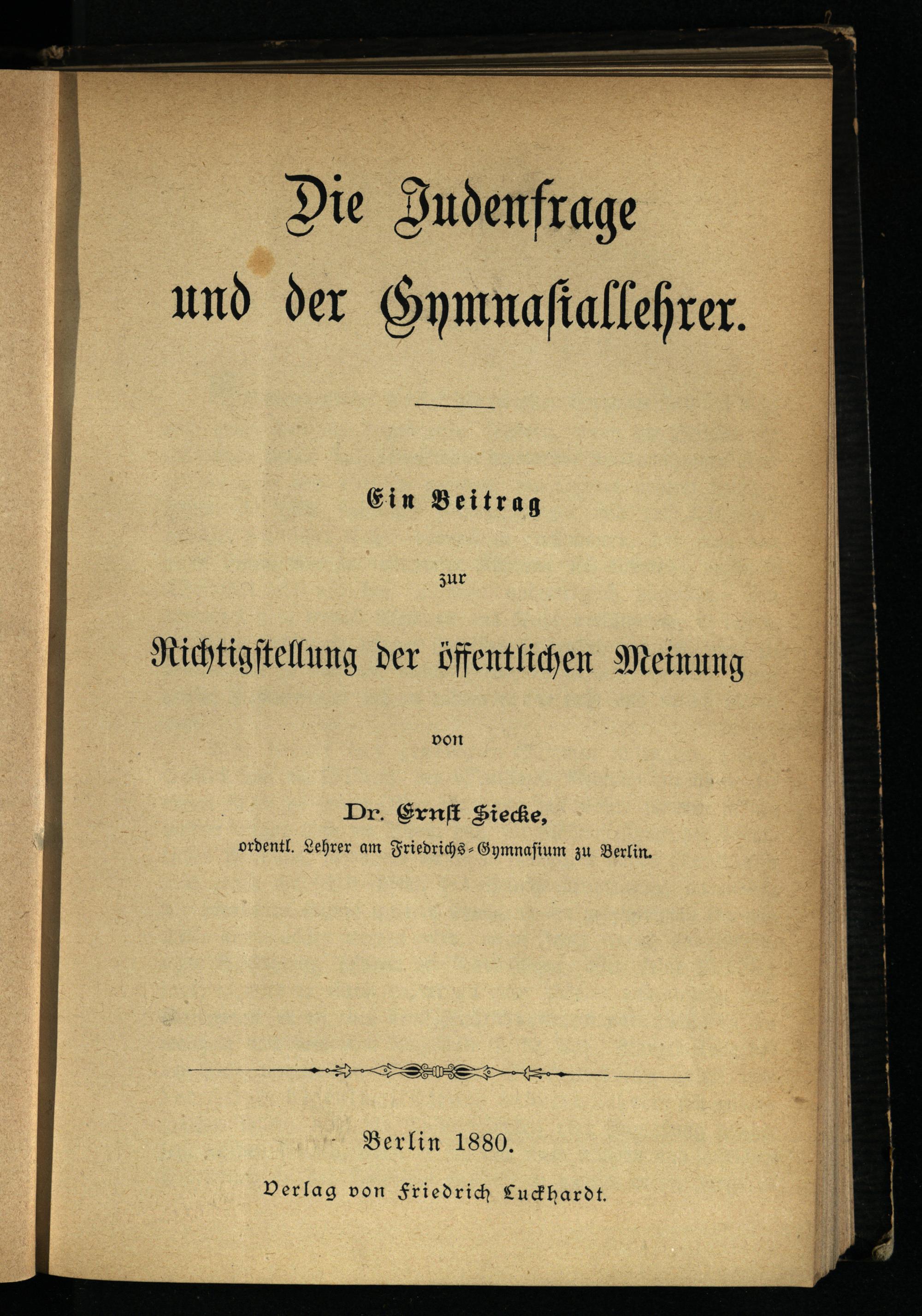 Die Judenfrage und der Gymnasiallehrer : ein Beitrag zur Richtigstellung der öffentlichen Meinung / von Dr. Ernst Siecke, ordentl. Lehrer am Friedrichs-Gymnasium zu Berlin