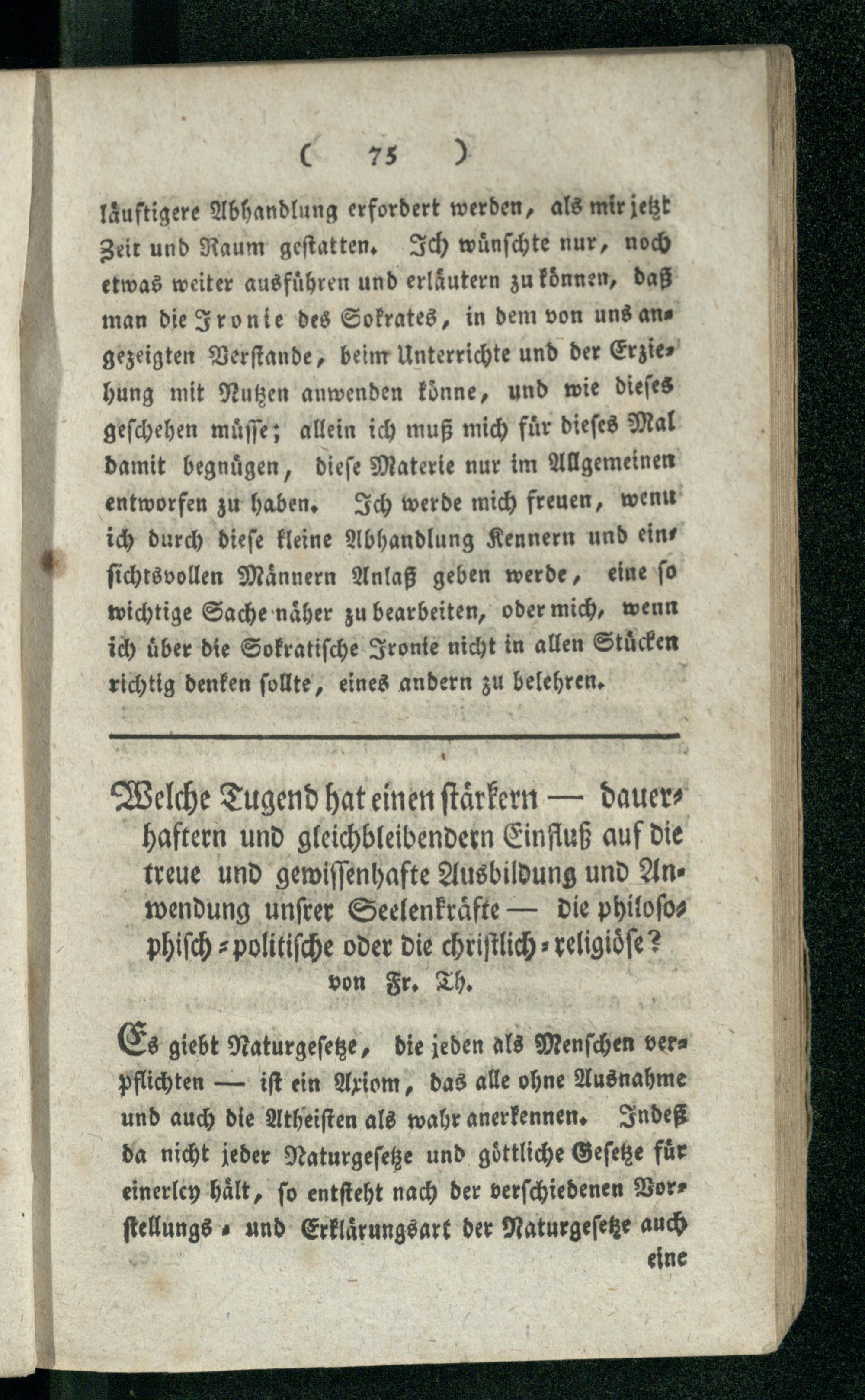 Welche Tugend hat einen stärkern - dauerhaftern und gleichbleibendern Einfluß auf die treue und gewissenhafte Ausbildung und Anwendung unsrer Seelenkräfte - die philosophisch-politische oder die christlich-religiöse? von Fr. Th.