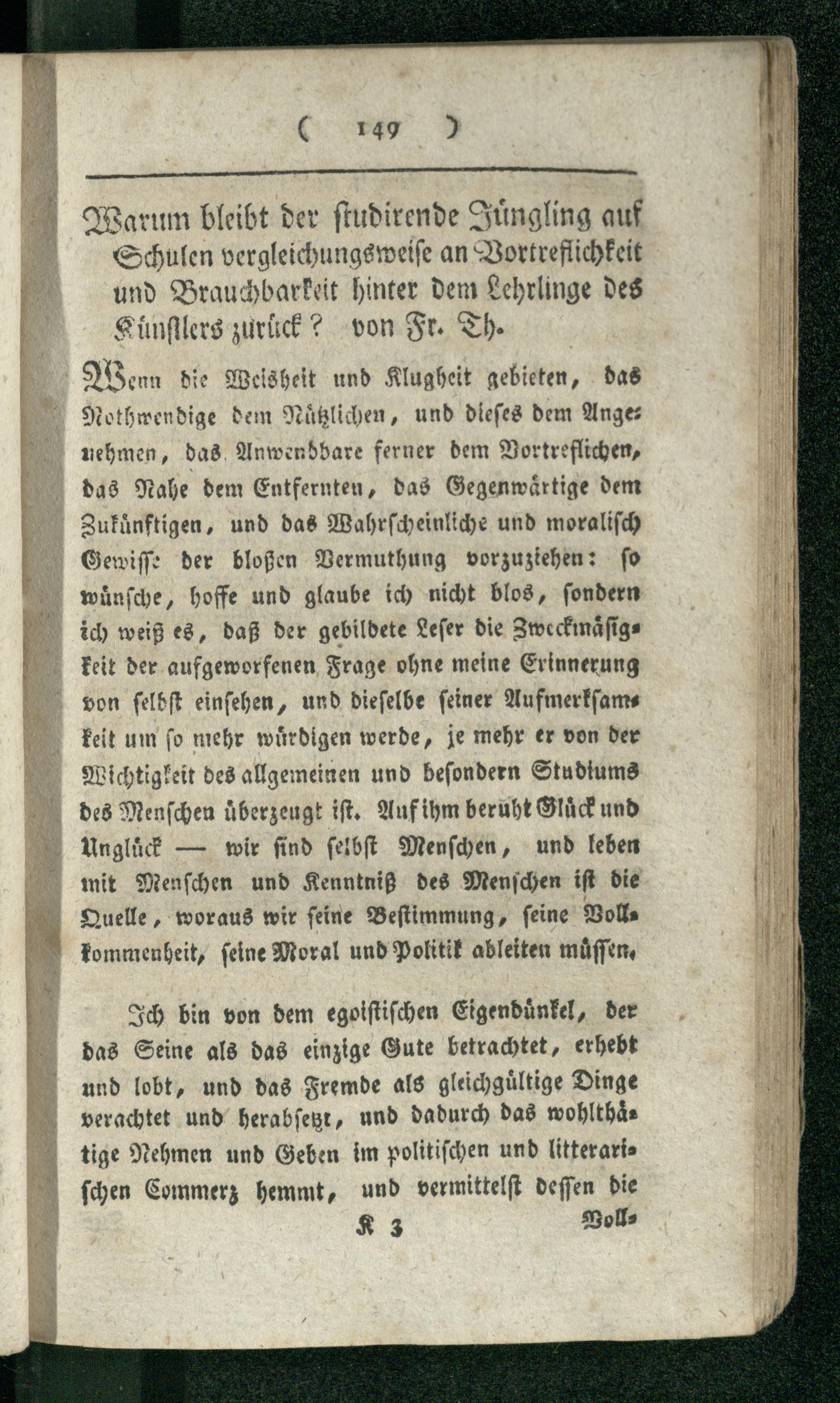 Warum bleibt der studirende Jüngling auf Schulen vergleichungsweise an Vortreflichkeit und Brauchbarkeit hinter dem Lehrlinge des Künstlers zurück? von Fr. Th.
