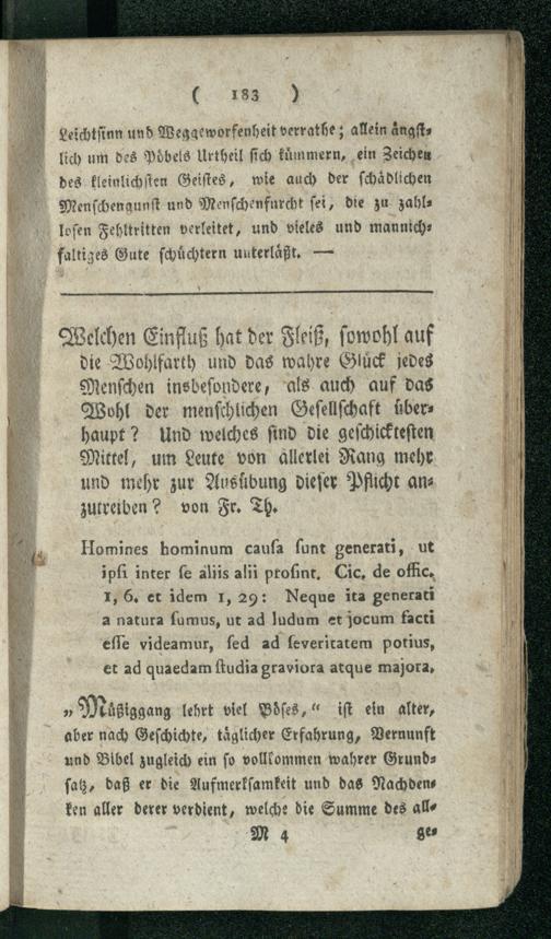 Welchen Einfluß hat der Fleiß, sowohl auf die Wohlfarth und das wahre Glück jedes Menschen insbesondere, als auch auf das Wohl der menschlichen Gesellschaft überhaupt? Und welches sind die geschicktesten Mittel, um Leute von allerlei Rang mehr und mehr zur Ausübung dieser Pflicht anzutreiben? von Fr. Th.