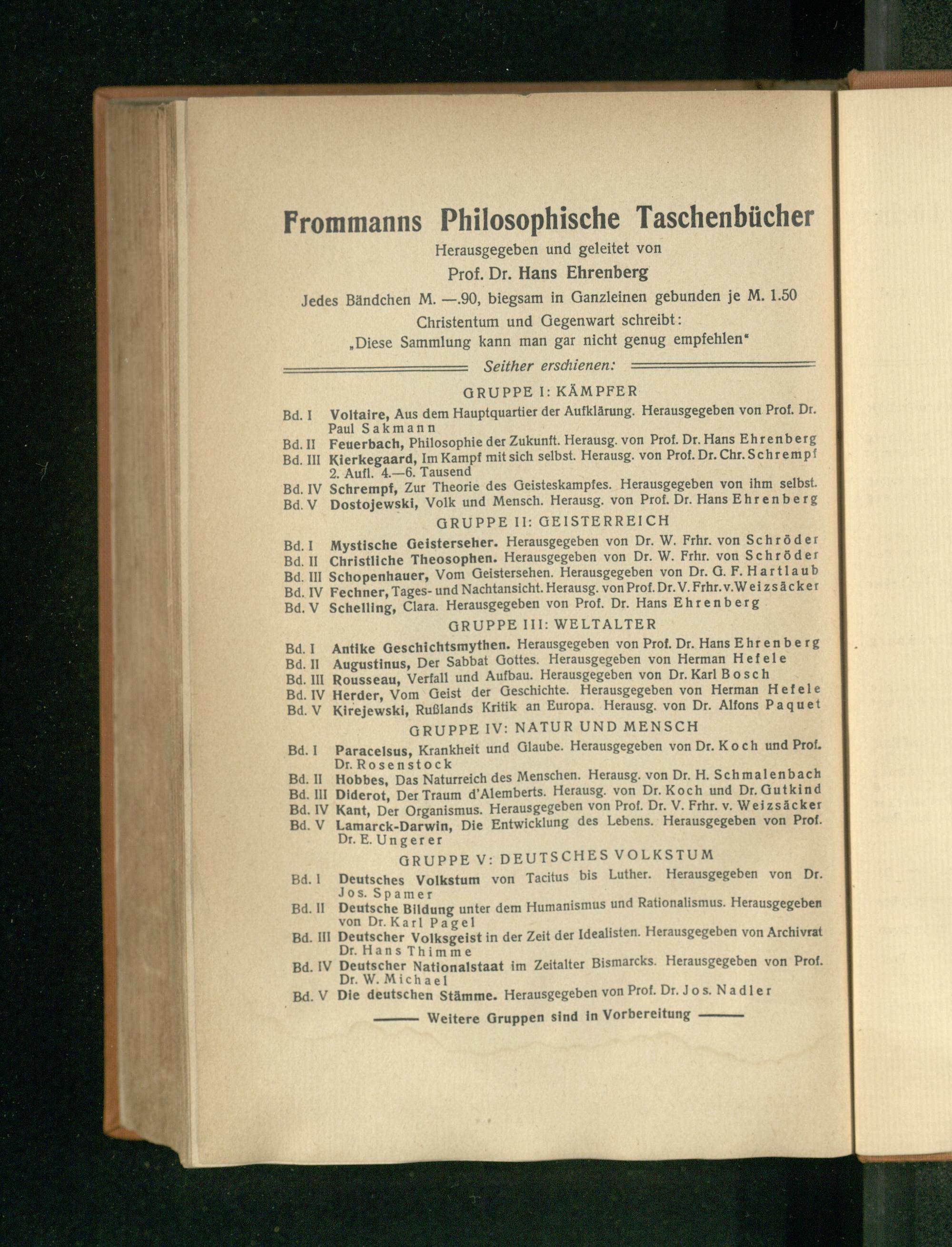 Reihenverzeichnis "Frommanns Philosophische Taschenbücher"