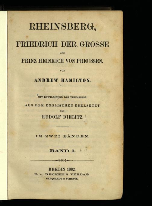 Rheinsberg, Friedrich der Grosse und Prinz Heinrich von Preussen : in 2 Bänden / von Andrew Hamilton. Mit Bewilligung des Verf. aus d. Engl. übers. von Rudolf Dielitz