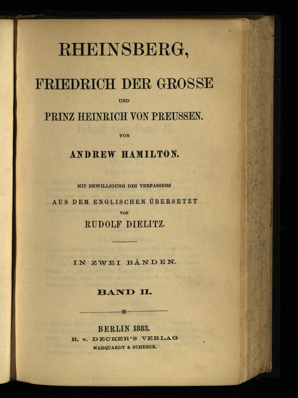 Rheinsberg, Friedrich der Grosse und Prinz Heinrich von Preussen : in 2 Bänden / von Andrew Hamilton. Mit Bewilligung des Verf. aus d. Engl. übers. von Rudolf Dielitz
