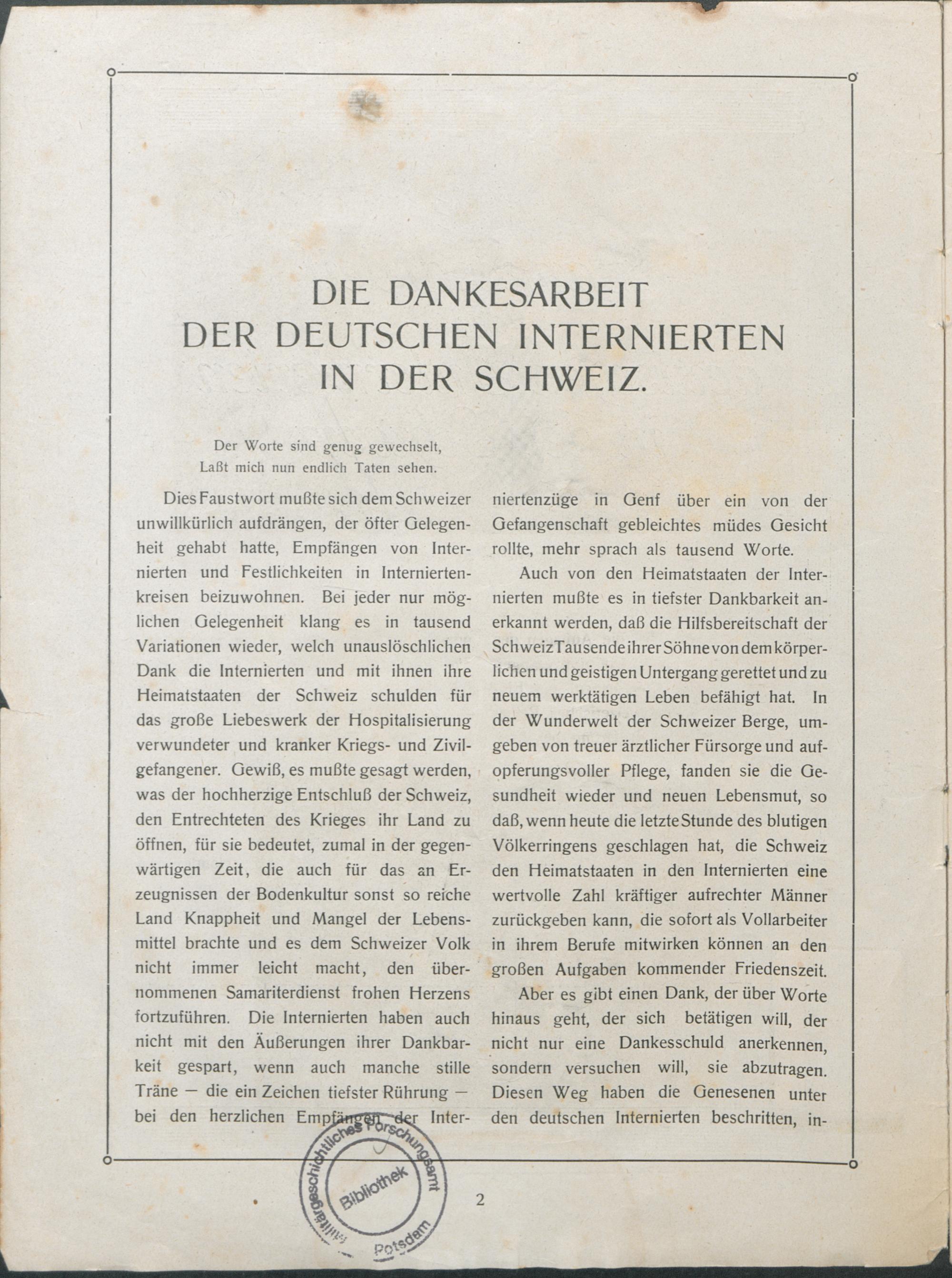 Die Dankesarbeit der Deutschen Internierten in der Schweiz.