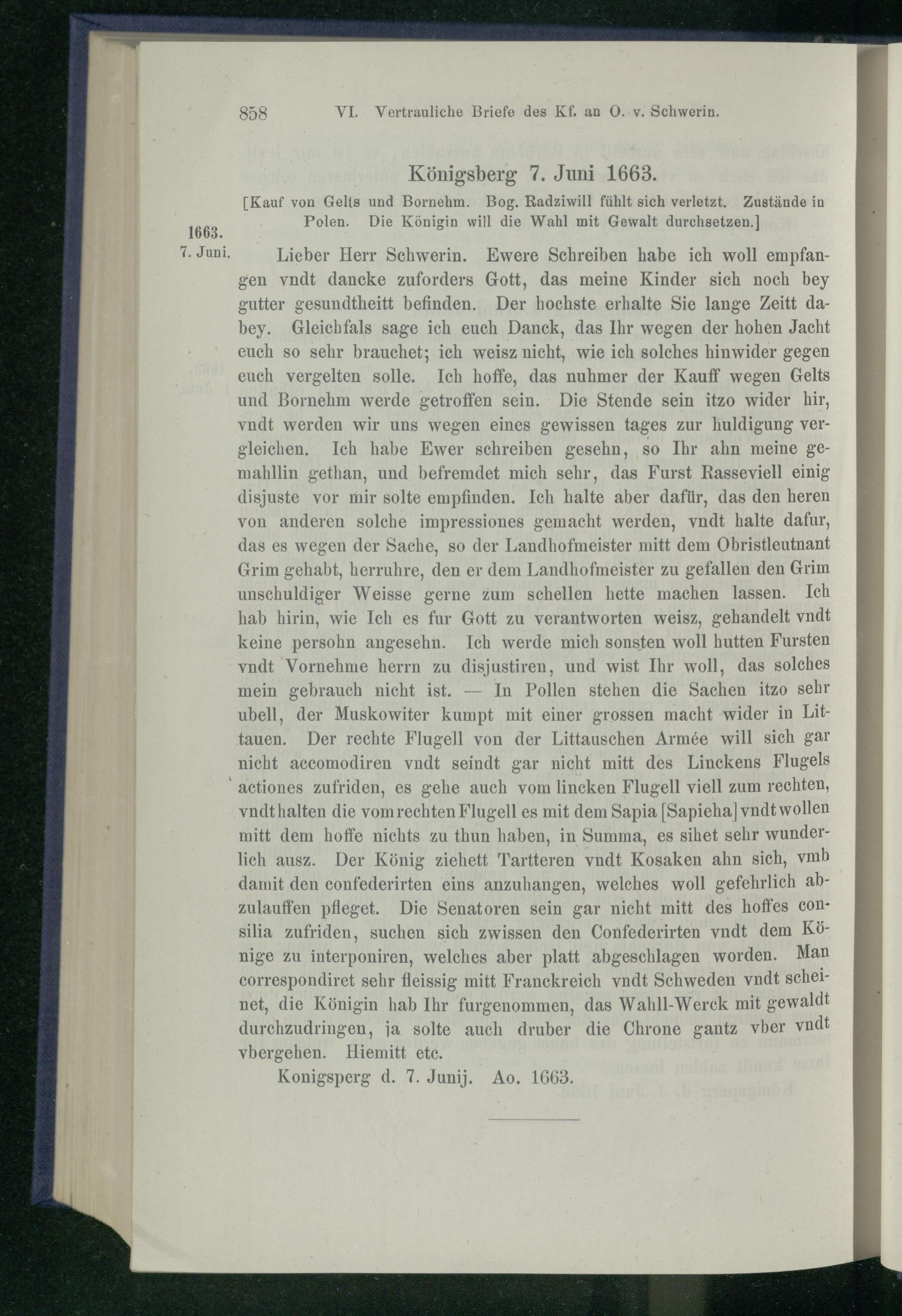 VI. Vertrauliche Briefe des Kurfürsten an Otto v. Schwerin 1661 - 1663.