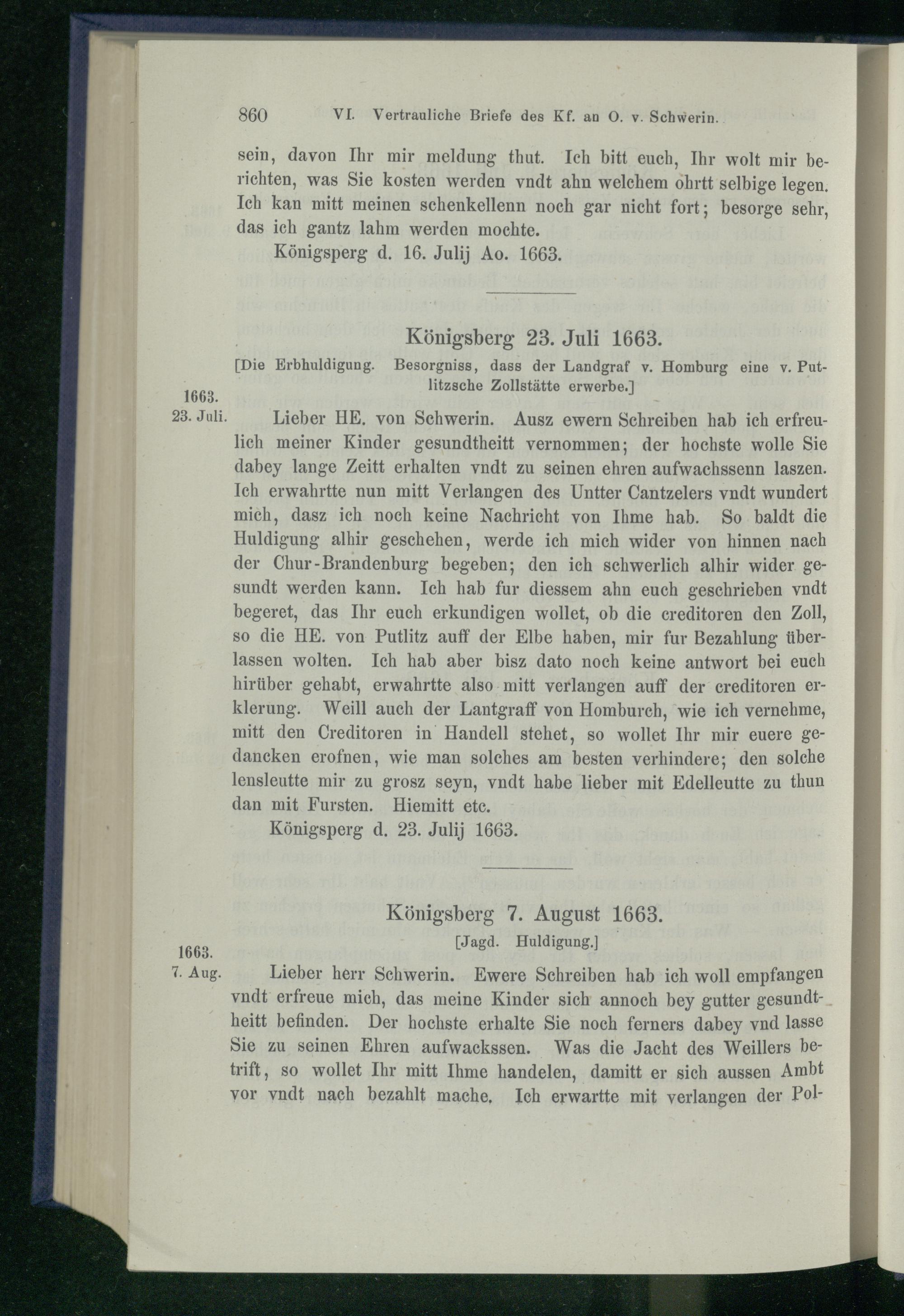 VI. Vertrauliche Briefe des Kurfürsten an Otto v. Schwerin 1661 - 1663.
