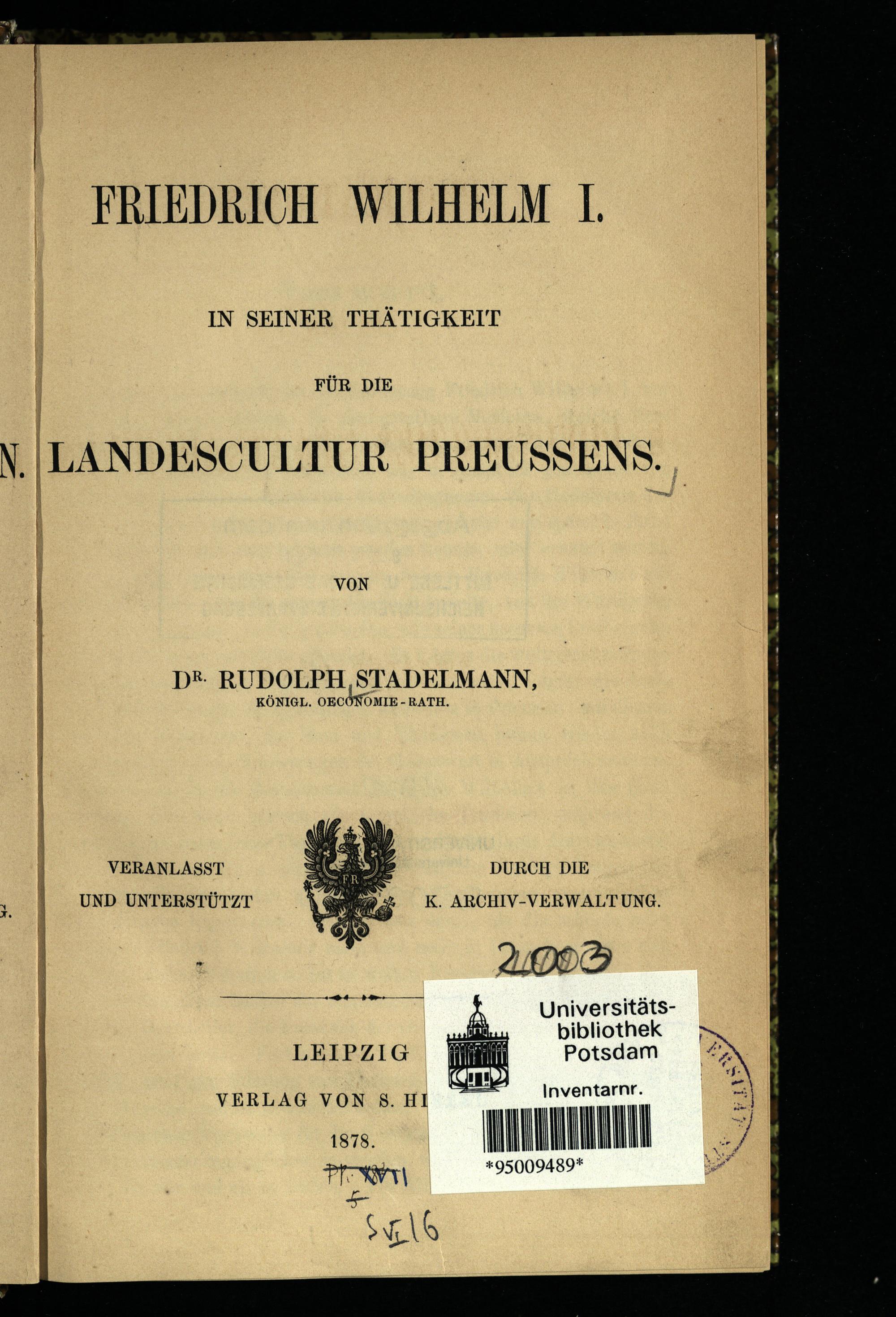 Friedrich Wilhelm I. in seiner Thätigkeit für die Landescultur Preußens / von Rudolph Stadelmann