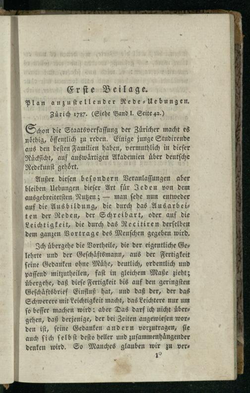Erste Beilage. Plan anzustellender Rede-Uebungen. Zürich 1787.