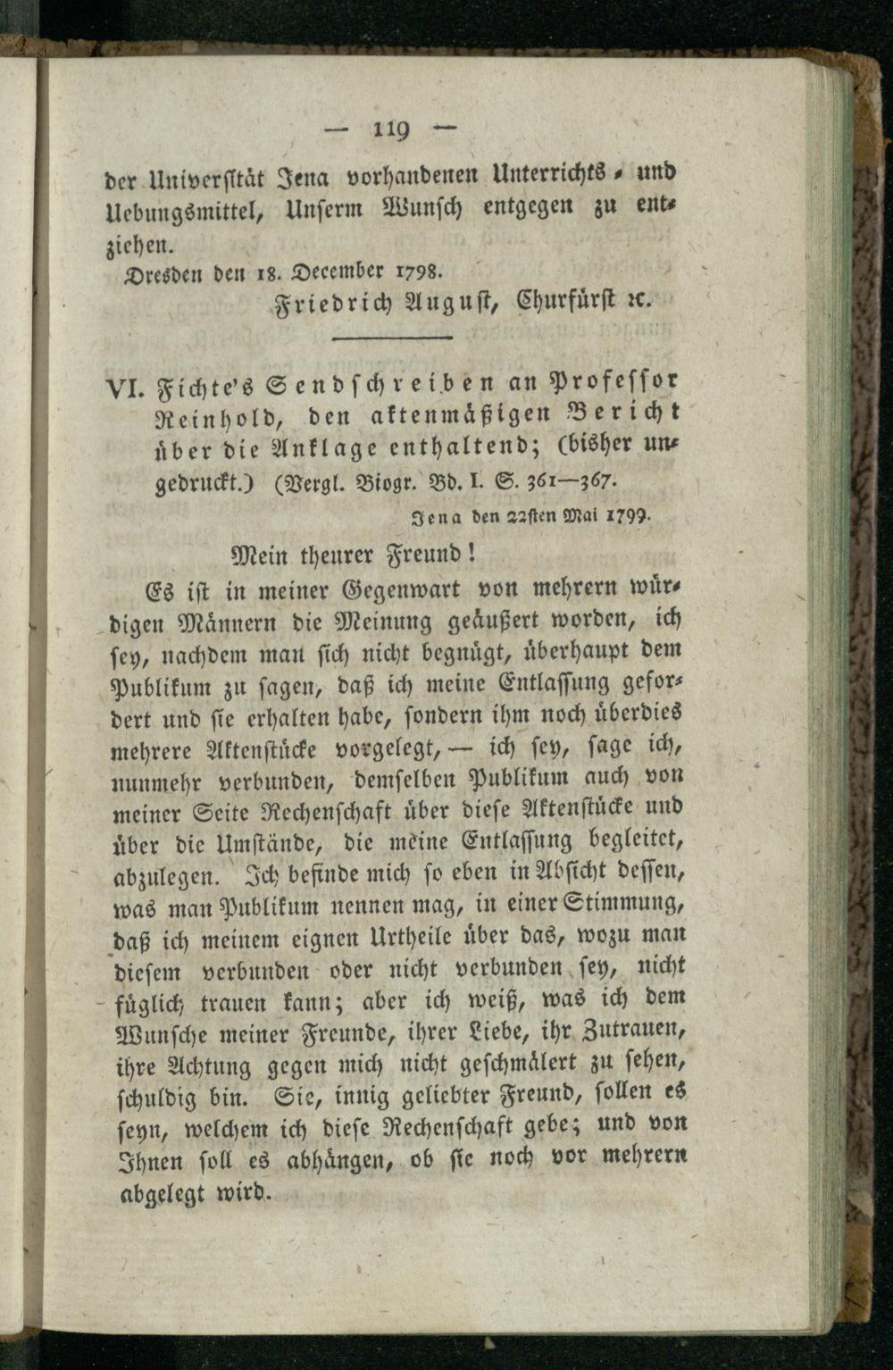 VI. Fichte's Sendschreiben an Professor Reinhold, den aktenmäßigen Bericht über die...