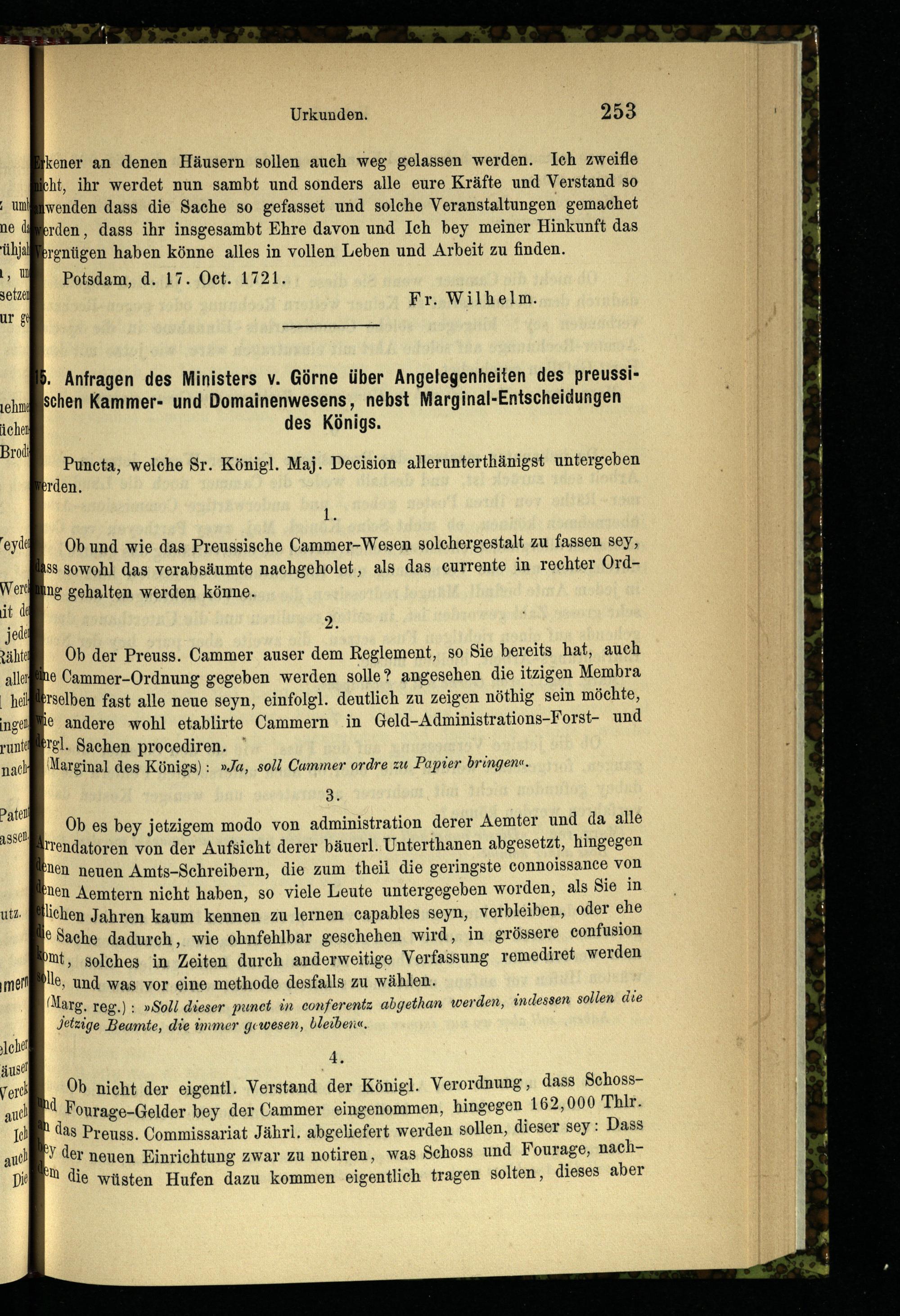 15. Anfragen des Ministers v. Görne über Angelegenheiten des preussischen Kammer-...