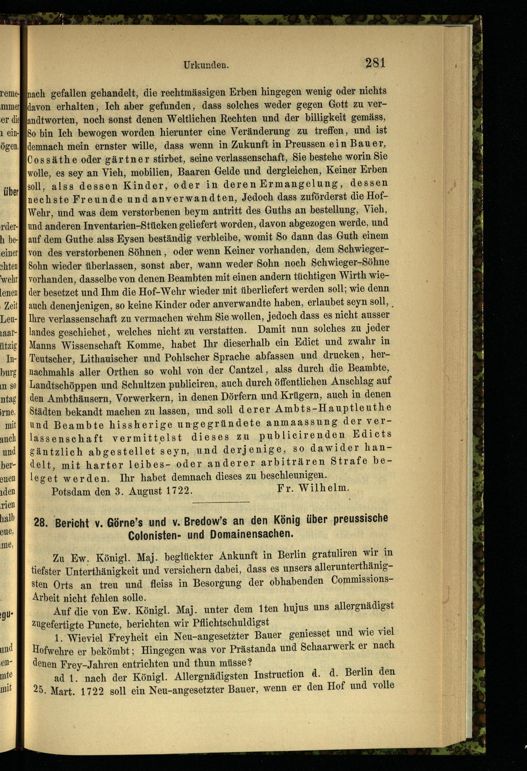 28. Bericht v. Görne's und v. Bredow's an den König über preussische Colonisten-...