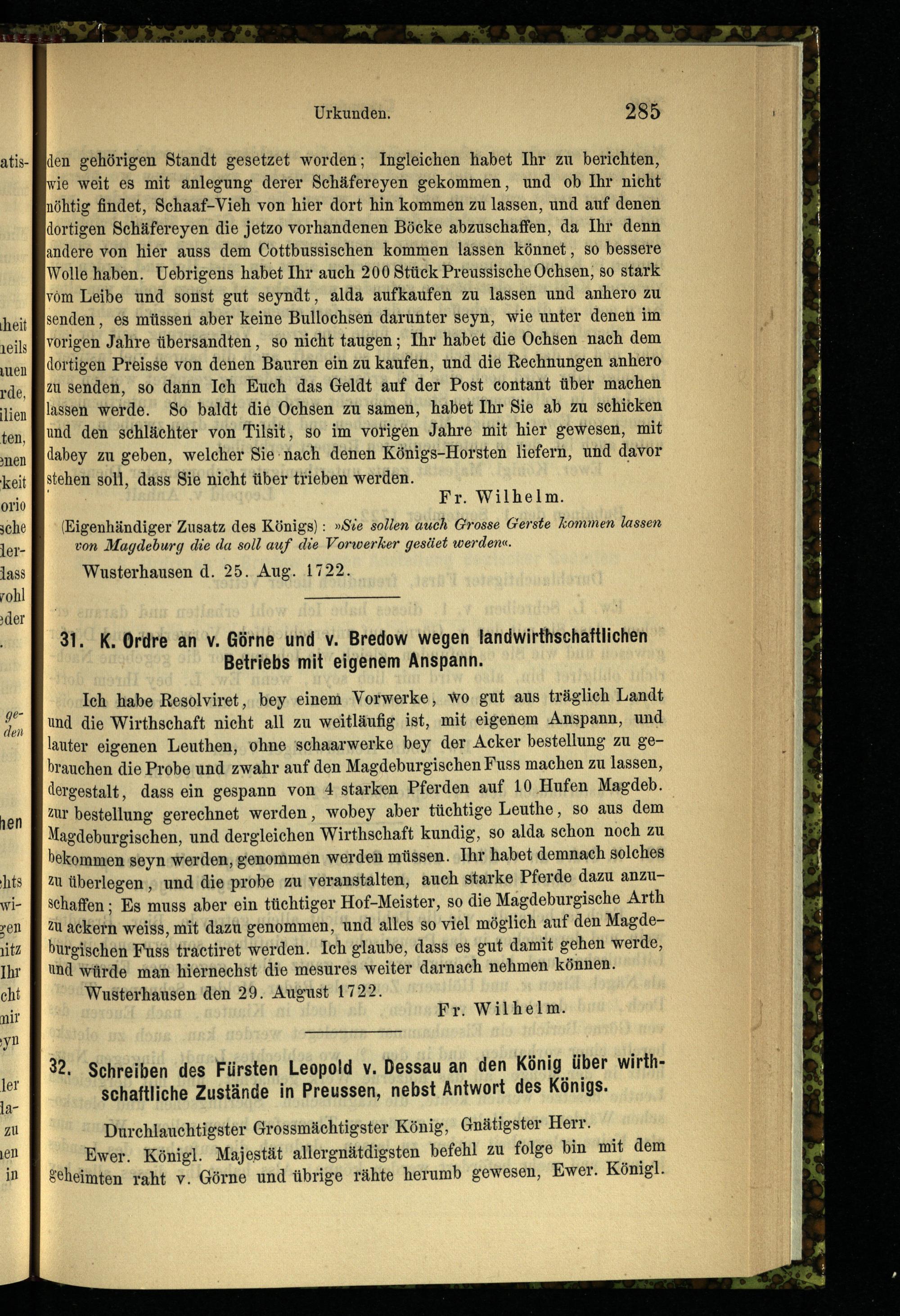 32. Schreiben des Fürsten Leopold v. Dessau an den König über wirthschaftliche Zustände...