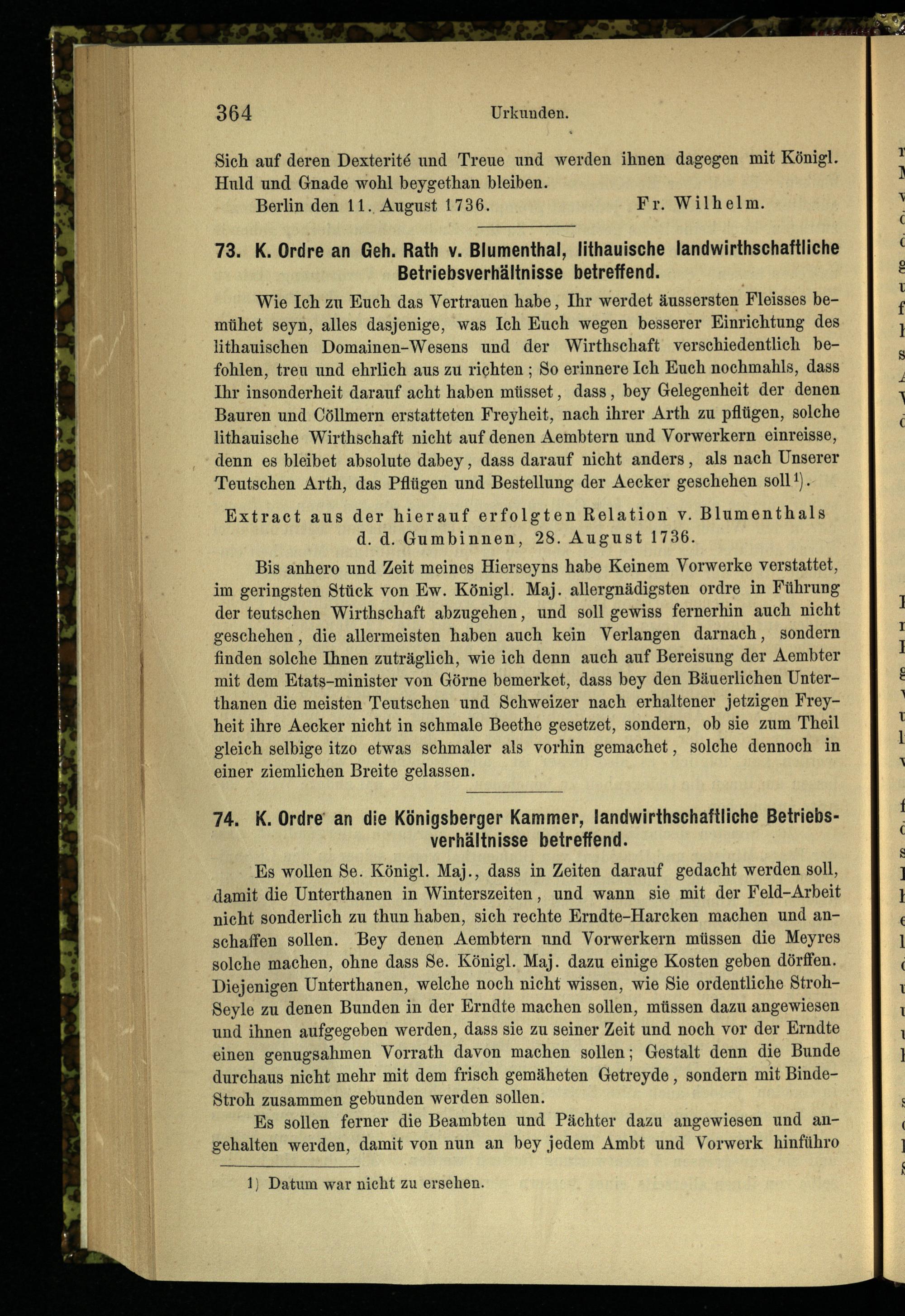 74. K. Ordre an die Königsberger Kammer, landwirthschaftliche Betriebsverhältnisse...