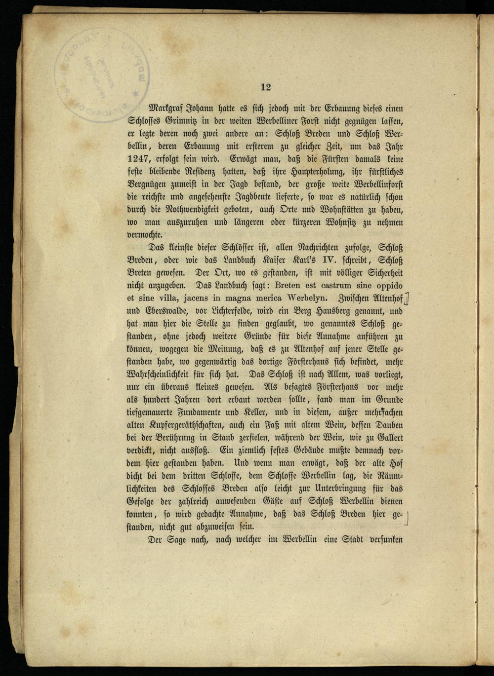 Die Askanier-Burg Werbellin : ein Beitrag zur Geschichte der Mark ; Auf der anlassung seiner Königlichen Hochzeit des Prinzen Karl von Preussen / von F. Brunold