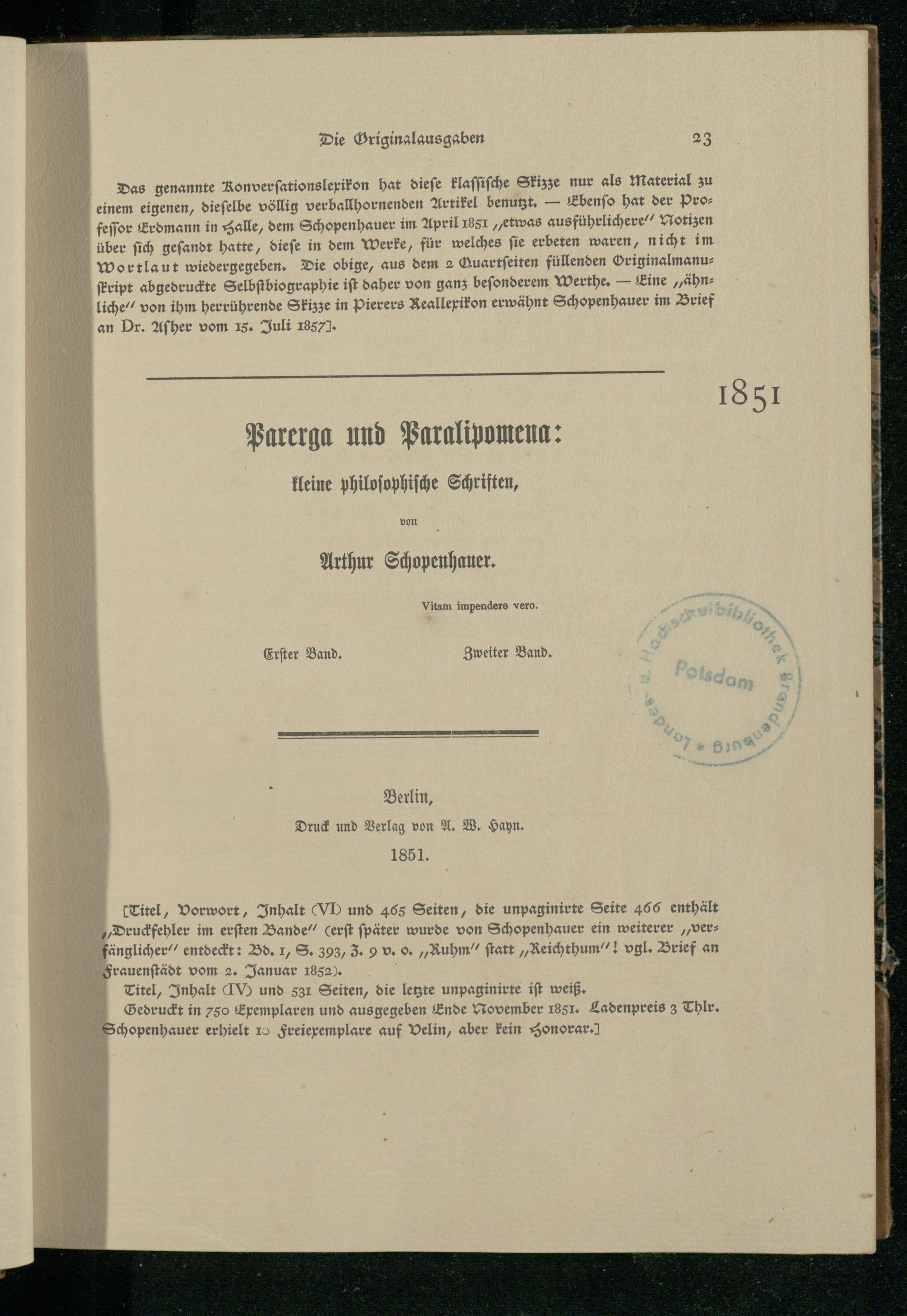 Edita und Inedita Schopenhaueriana : eine Schopenhauer-Bibliographie sowie Randschriften und Briefe Arthur Schopenhauer's mit Porträt, Wappen und Facsimile der Handschrift des Meisters / hrsg. zu seinem hundertjährigen Geburtstage von Eduard Grisebach