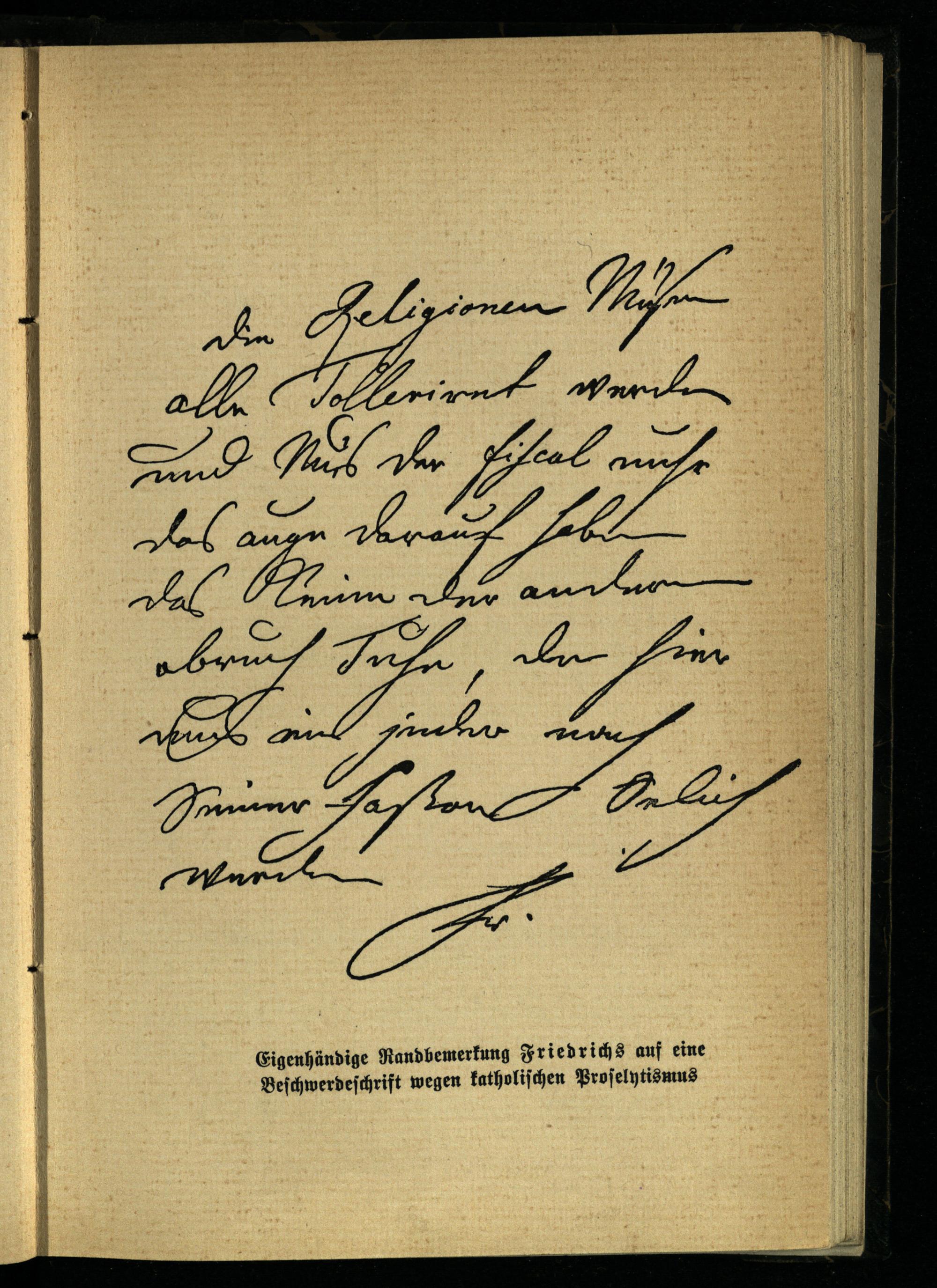 Eigenhändige Randbemerkung Friedrichs auf eine Beschwerdeschrift wegen katholischen Proselytismus