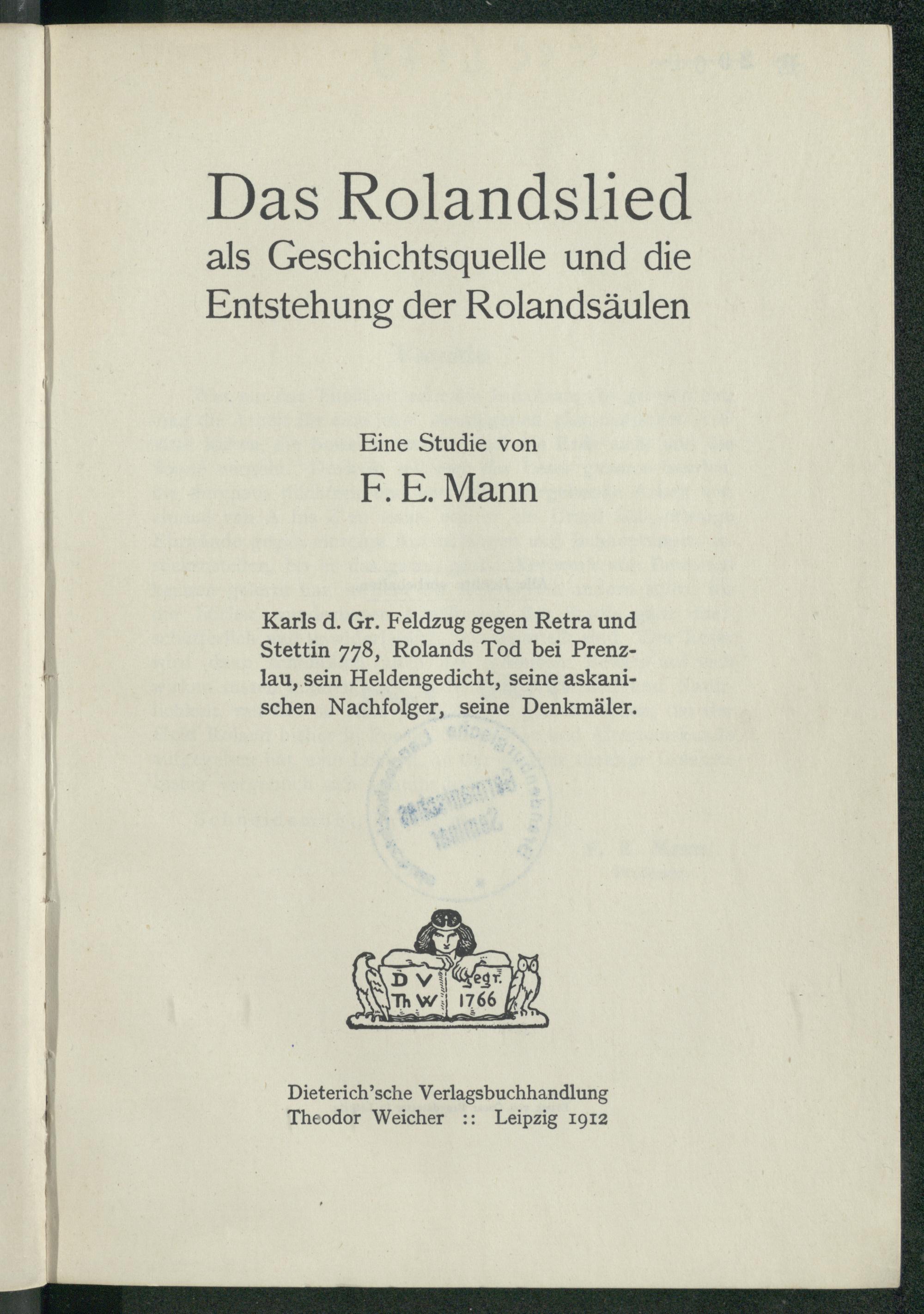 Das Rolandslied : als Geschichtsquelle und die Entstehung der Rolandsäulen$deine Studie ; Karls des Großen Feldzug gegen Retra und Stettin 778, Rolands Tod bei Prenzlau, sein Heldengedicht, seine askanischen Nachfolger, seine Denkmäler / von F. E. Mann