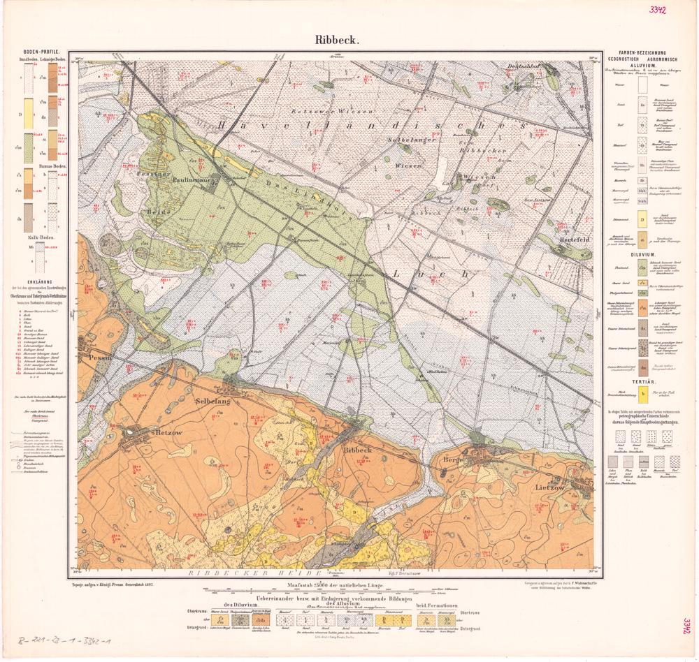 [Neue Nr. 3342] (1882) Ribbeck : [geologische Karte] / geognostisch unda gronomisch aufgenommen durch F. Wahnschaffe ; unter Hülfeleistung des Culturtechiker Wölfer