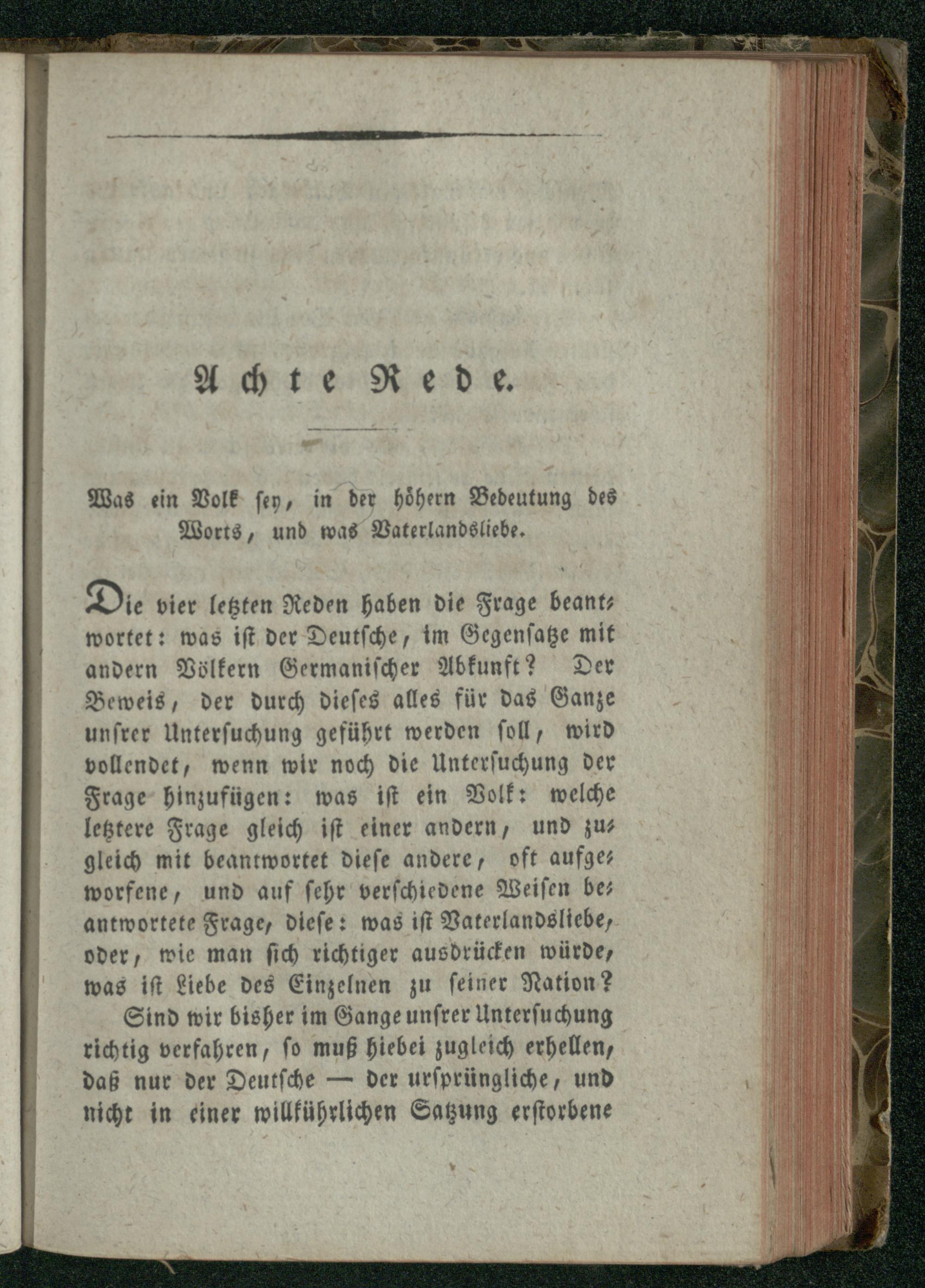 Achte Rede. Was ein Volk sey, in der höhern Bedeutung des Worts, und was Vaterlandsliebe.