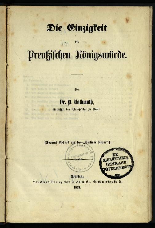 Die Einzigkeit der preussischen Königswürde / von P. Volkmuth
