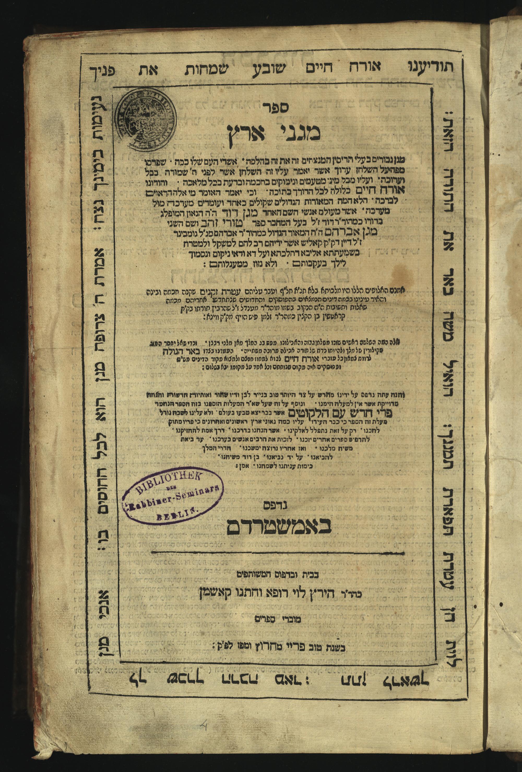 Sefer Magine erets : ... ʿal ha-Shulḥan ʿarukh ... Oraḥ ḥayim ... / ... ha-lo hemah ha-meʾorot ha-gedolim ... ha-shem ha-eḥad Magen Daṿid h.h. ha-gaʾon ... Daṿid ... baʿal ha-meḥaber sefer Ṭure zahav ṿe-shem ha-sheni Magen Avraham h.h. ... Avraham Segal Gumbiner z.l. dayan di-ḳ.ḳ. Ḳalish ... ṿe-ʿavar ʿalehem ʿAṭeret zeḳenim ... Mendel ... she-hirbits torato be-ḳ.ḳ. Ḳroṭoshin ben ha-katsin ... Zalman Fish Hoif mi-ḳ.ḳ. Ṿina: ... ha-ʿamadnu be-tsedo Beʾer ha-golah ... ṿe-hosafnu be-zeh ha-sefer ... Peri ḥadash ʿim ha-liḳuṭim ....ספר מגיני ארץ : ... על השלחן ערוך ... אורח חיים ... / ... הלא המה המאורות הגדולים ... השם האחד מגן דוד ... ה״ה הגאון ... דוד ... בעל המחבר ספר טורי זהב ושם השני מגן אברהם ה״ה ... אברהם סג״ל גומבינר ... דיין דק״ק קאליש ...ועבר עליהם עטרת זקנים ... מענדל ... שהרביץ תורתו בק״ק קראטשין בן הקצין ... זלמן פיש הויף מק״ק ווינא: העמדנו בצדו באר הגולה ... והוספנו בזה הספר ... פרי חדש עם הלקוטים ...