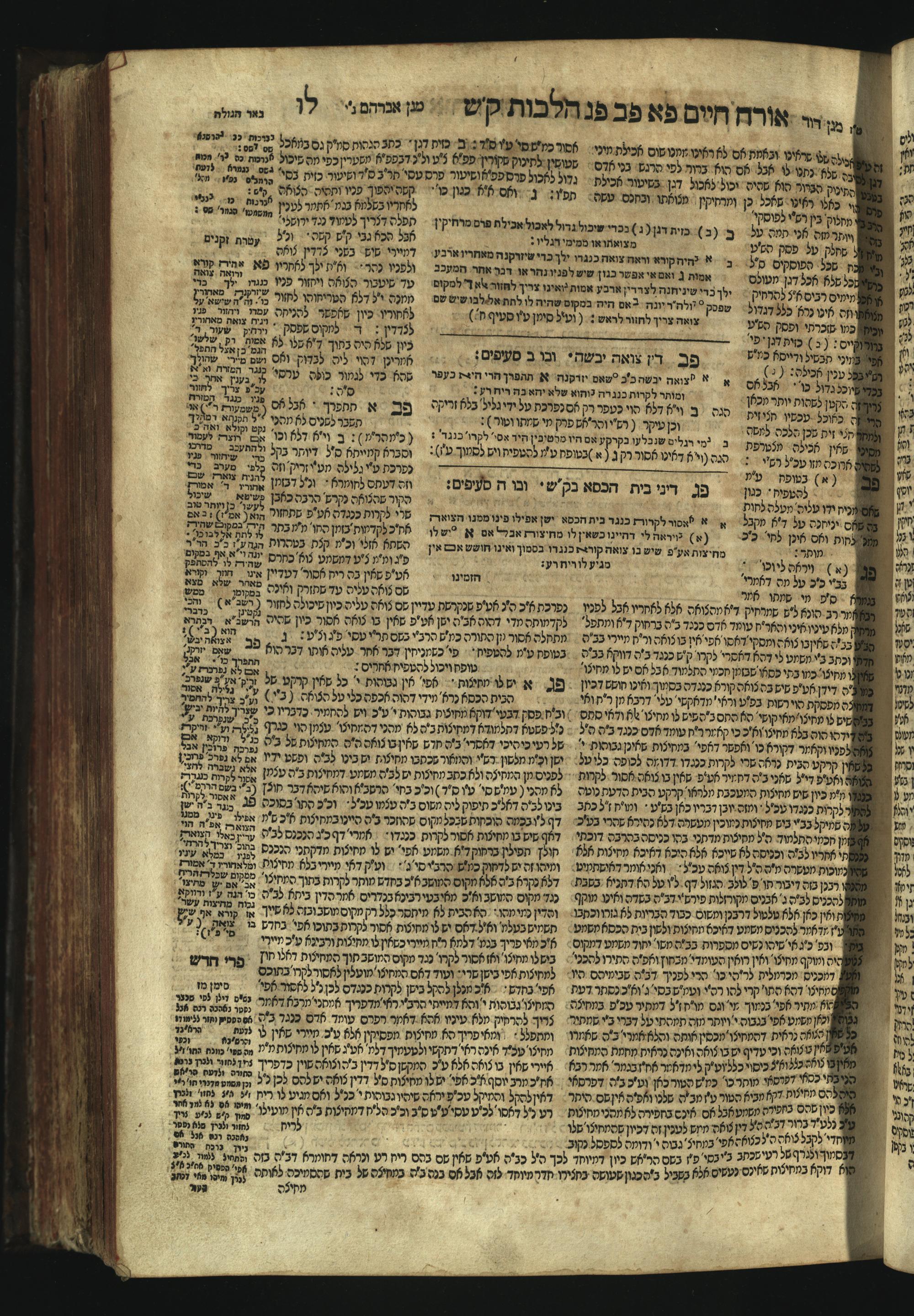 Sefer Magine erets : ... ʿal ha-Shulḥan ʿarukh ... Oraḥ ḥayim ... / ... ha-lo hemah ha-meʾorot ha-gedolim ... ha-shem ha-eḥad Magen Daṿid h.h. ha-gaʾon ... Daṿid ... baʿal ha-meḥaber sefer Ṭure zahav ṿe-shem ha-sheni Magen Avraham h.h. ... Avraham Segal Gumbiner z.l. dayan di-ḳ.ḳ. Ḳalish ... ṿe-ʿavar ʿalehem ʿAṭeret zeḳenim ... Mendel ... she-hirbits torato be-ḳ.ḳ. Ḳroṭoshin ben ha-katsin ... Zalman Fish Hoif mi-ḳ.ḳ. Ṿina: ... ha-ʿamadnu be-tsedo Beʾer ha-golah ... ṿe-hosafnu be-zeh ha-sefer ... Peri ḥadash ʿim ha-liḳuṭim ....ספר מגיני ארץ : ... על השלחן ערוך ... אורח חיים ... / ... הלא המה המאורות הגדולים ... השם האחד מגן דוד ... ה״ה הגאון ... דוד ... בעל המחבר ספר טורי זהב ושם השני מגן אברהם ה״ה ... אברהם סג״ל גומבינר ... דיין דק״ק קאליש ...ועבר עליהם עטרת זקנים ... מענדל ... שהרביץ תורתו בק״ק קראטשין בן הקצין ... זלמן פיש הויף מק״ק ווינא: העמדנו בצדו באר הגולה ... והוספנו בזה הספר ... פרי חדש עם הלקוטים ...