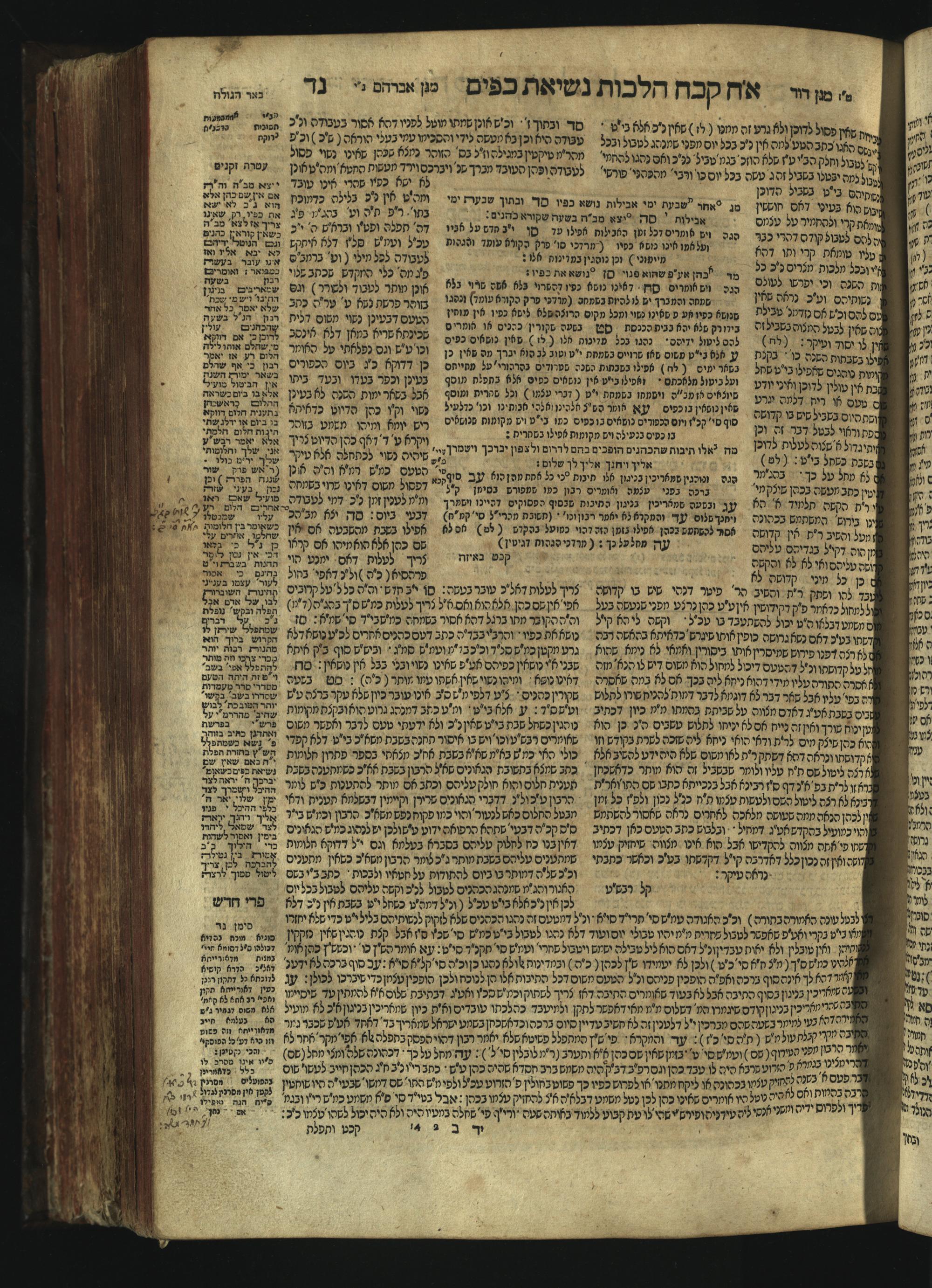 Sefer Magine erets : ... ʿal ha-Shulḥan ʿarukh ... Oraḥ ḥayim ... / ... ha-lo hemah ha-meʾorot ha-gedolim ... ha-shem ha-eḥad Magen Daṿid h.h. ha-gaʾon ... Daṿid ... baʿal ha-meḥaber sefer Ṭure zahav ṿe-shem ha-sheni Magen Avraham h.h. ... Avraham Segal Gumbiner z.l. dayan di-ḳ.ḳ. Ḳalish ... ṿe-ʿavar ʿalehem ʿAṭeret zeḳenim ... Mendel ... she-hirbits torato be-ḳ.ḳ. Ḳroṭoshin ben ha-katsin ... Zalman Fish Hoif mi-ḳ.ḳ. Ṿina: ... ha-ʿamadnu be-tsedo Beʾer ha-golah ... ṿe-hosafnu be-zeh ha-sefer ... Peri ḥadash ʿim ha-liḳuṭim ....ספר מגיני ארץ : ... על השלחן ערוך ... אורח חיים ... / ... הלא המה המאורות הגדולים ... השם האחד מגן דוד ... ה״ה הגאון ... דוד ... בעל המחבר ספר טורי זהב ושם השני מגן אברהם ה״ה ... אברהם סג״ל גומבינר ... דיין דק״ק קאליש ...ועבר עליהם עטרת זקנים ... מענדל ... שהרביץ תורתו בק״ק קראטשין בן הקצין ... זלמן פיש הויף מק״ק ווינא: העמדנו בצדו באר הגולה ... והוספנו בזה הספר ... פרי חדש עם הלקוטים ...