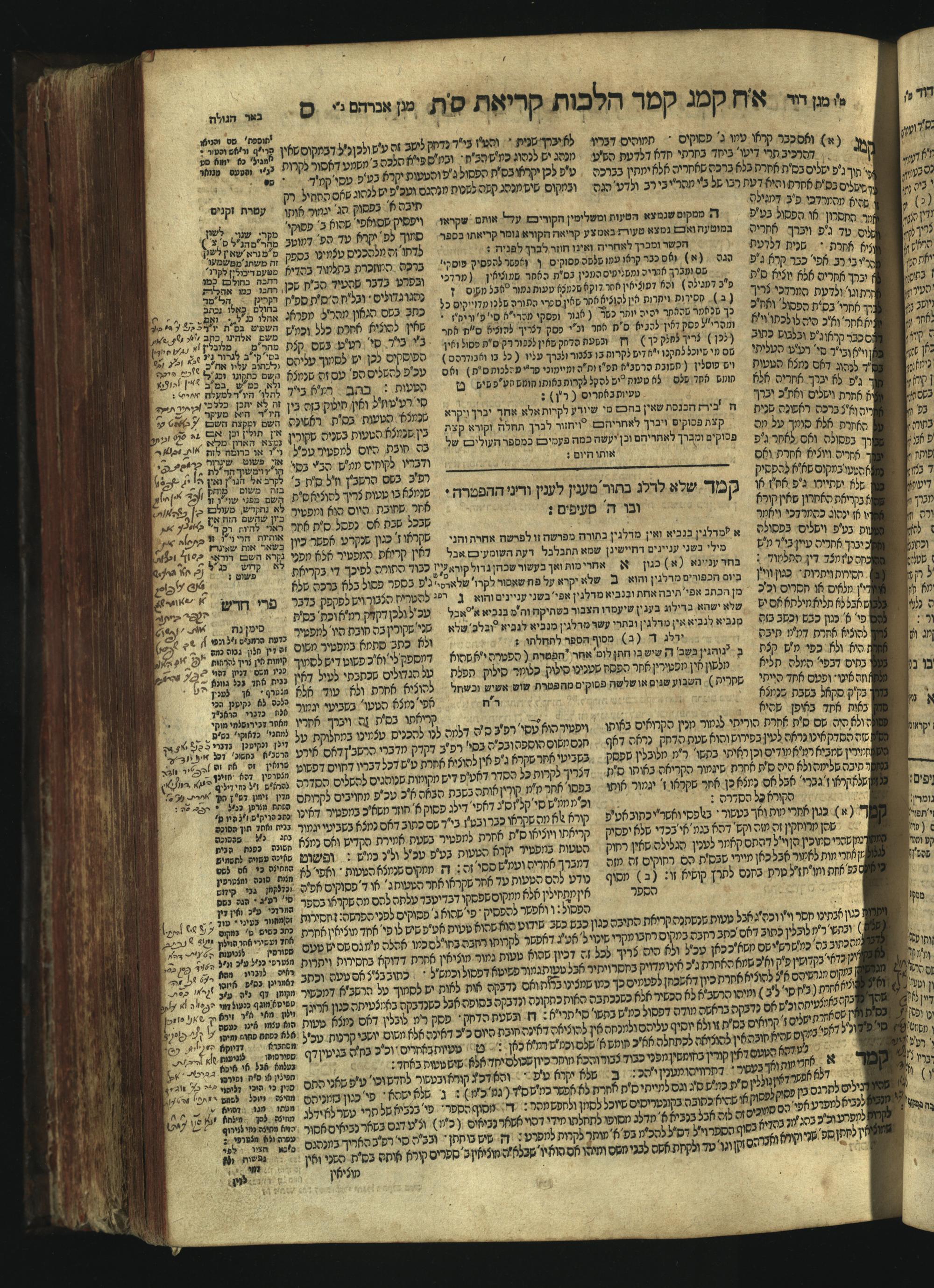 Sefer Magine erets : ... ʿal ha-Shulḥan ʿarukh ... Oraḥ ḥayim ... / ... ha-lo hemah ha-meʾorot ha-gedolim ... ha-shem ha-eḥad Magen Daṿid h.h. ha-gaʾon ... Daṿid ... baʿal ha-meḥaber sefer Ṭure zahav ṿe-shem ha-sheni Magen Avraham h.h. ... Avraham Segal Gumbiner z.l. dayan di-ḳ.ḳ. Ḳalish ... ṿe-ʿavar ʿalehem ʿAṭeret zeḳenim ... Mendel ... she-hirbits torato be-ḳ.ḳ. Ḳroṭoshin ben ha-katsin ... Zalman Fish Hoif mi-ḳ.ḳ. Ṿina: ... ha-ʿamadnu be-tsedo Beʾer ha-golah ... ṿe-hosafnu be-zeh ha-sefer ... Peri ḥadash ʿim ha-liḳuṭim ....ספר מגיני ארץ : ... על השלחן ערוך ... אורח חיים ... / ... הלא המה המאורות הגדולים ... השם האחד מגן דוד ... ה״ה הגאון ... דוד ... בעל המחבר ספר טורי זהב ושם השני מגן אברהם ה״ה ... אברהם סג״ל גומבינר ... דיין דק״ק קאליש ...ועבר עליהם עטרת זקנים ... מענדל ... שהרביץ תורתו בק״ק קראטשין בן הקצין ... זלמן פיש הויף מק״ק ווינא: העמדנו בצדו באר הגולה ... והוספנו בזה הספר ... פרי חדש עם הלקוטים ...