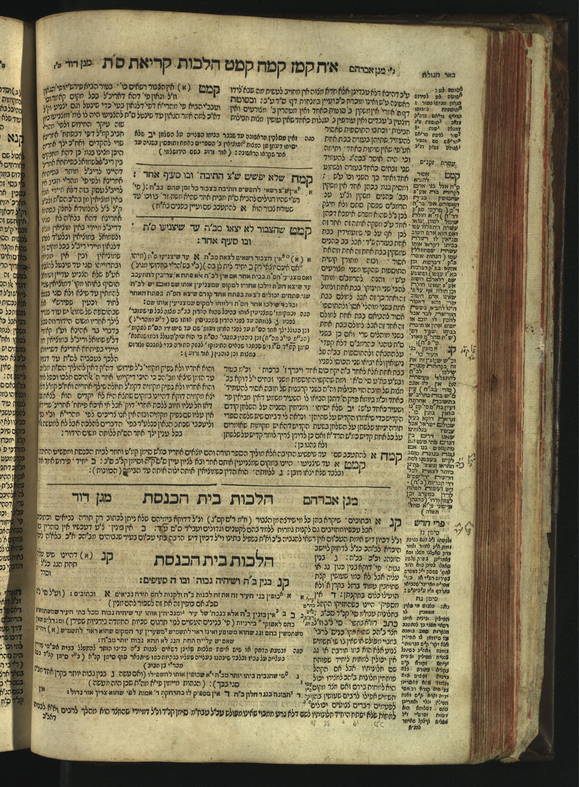 Sefer Magine erets : ... ʿal ha-Shulḥan ʿarukh ... Oraḥ ḥayim ... / ... ha-lo hemah ha-meʾorot ha-gedolim ... ha-shem ha-eḥad Magen Daṿid h.h. ha-gaʾon ... Daṿid ... baʿal ha-meḥaber sefer Ṭure zahav ṿe-shem ha-sheni Magen Avraham h.h. ... Avraham Segal Gumbiner z.l. dayan di-ḳ.ḳ. Ḳalish ... ṿe-ʿavar ʿalehem ʿAṭeret zeḳenim ... Mendel ... she-hirbits torato be-ḳ.ḳ. Ḳroṭoshin ben ha-katsin ... Zalman Fish Hoif mi-ḳ.ḳ. Ṿina: ... ha-ʿamadnu be-tsedo Beʾer ha-golah ... ṿe-hosafnu be-zeh ha-sefer ... Peri ḥadash ʿim ha-liḳuṭim ....ספר מגיני ארץ : ... על השלחן ערוך ... אורח חיים ... / ... הלא המה המאורות הגדולים ... השם האחד מגן דוד ... ה״ה הגאון ... דוד ... בעל המחבר ספר טורי זהב ושם השני מגן אברהם ה״ה ... אברהם סג״ל גומבינר ... דיין דק״ק קאליש ...ועבר עליהם עטרת זקנים ... מענדל ... שהרביץ תורתו בק״ק קראטשין בן הקצין ... זלמן פיש הויף מק״ק ווינא: העמדנו בצדו באר הגולה ... והוספנו בזה הספר ... פרי חדש עם הלקוטים ...