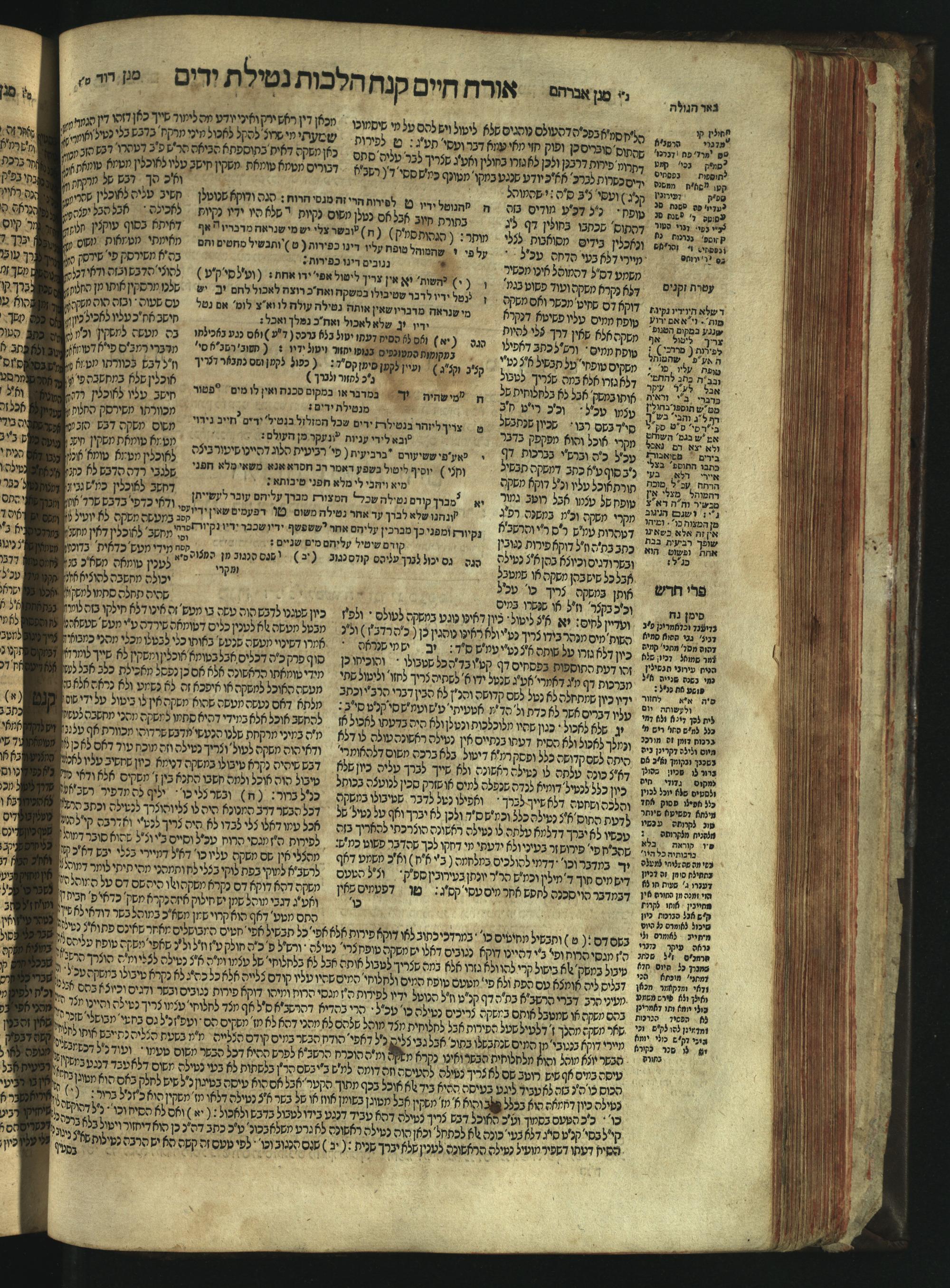 Sefer Magine erets : ... ʿal ha-Shulḥan ʿarukh ... Oraḥ ḥayim ... / ... ha-lo hemah ha-meʾorot ha-gedolim ... ha-shem ha-eḥad Magen Daṿid h.h. ha-gaʾon ... Daṿid ... baʿal ha-meḥaber sefer Ṭure zahav ṿe-shem ha-sheni Magen Avraham h.h. ... Avraham Segal Gumbiner z.l. dayan di-ḳ.ḳ. Ḳalish ... ṿe-ʿavar ʿalehem ʿAṭeret zeḳenim ... Mendel ... she-hirbits torato be-ḳ.ḳ. Ḳroṭoshin ben ha-katsin ... Zalman Fish Hoif mi-ḳ.ḳ. Ṿina: ... ha-ʿamadnu be-tsedo Beʾer ha-golah ... ṿe-hosafnu be-zeh ha-sefer ... Peri ḥadash ʿim ha-liḳuṭim ....ספר מגיני ארץ : ... על השלחן ערוך ... אורח חיים ... / ... הלא המה המאורות הגדולים ... השם האחד מגן דוד ... ה״ה הגאון ... דוד ... בעל המחבר ספר טורי זהב ושם השני מגן אברהם ה״ה ... אברהם סג״ל גומבינר ... דיין דק״ק קאליש ...ועבר עליהם עטרת זקנים ... מענדל ... שהרביץ תורתו בק״ק קראטשין בן הקצין ... זלמן פיש הויף מק״ק ווינא: העמדנו בצדו באר הגולה ... והוספנו בזה הספר ... פרי חדש עם הלקוטים ...