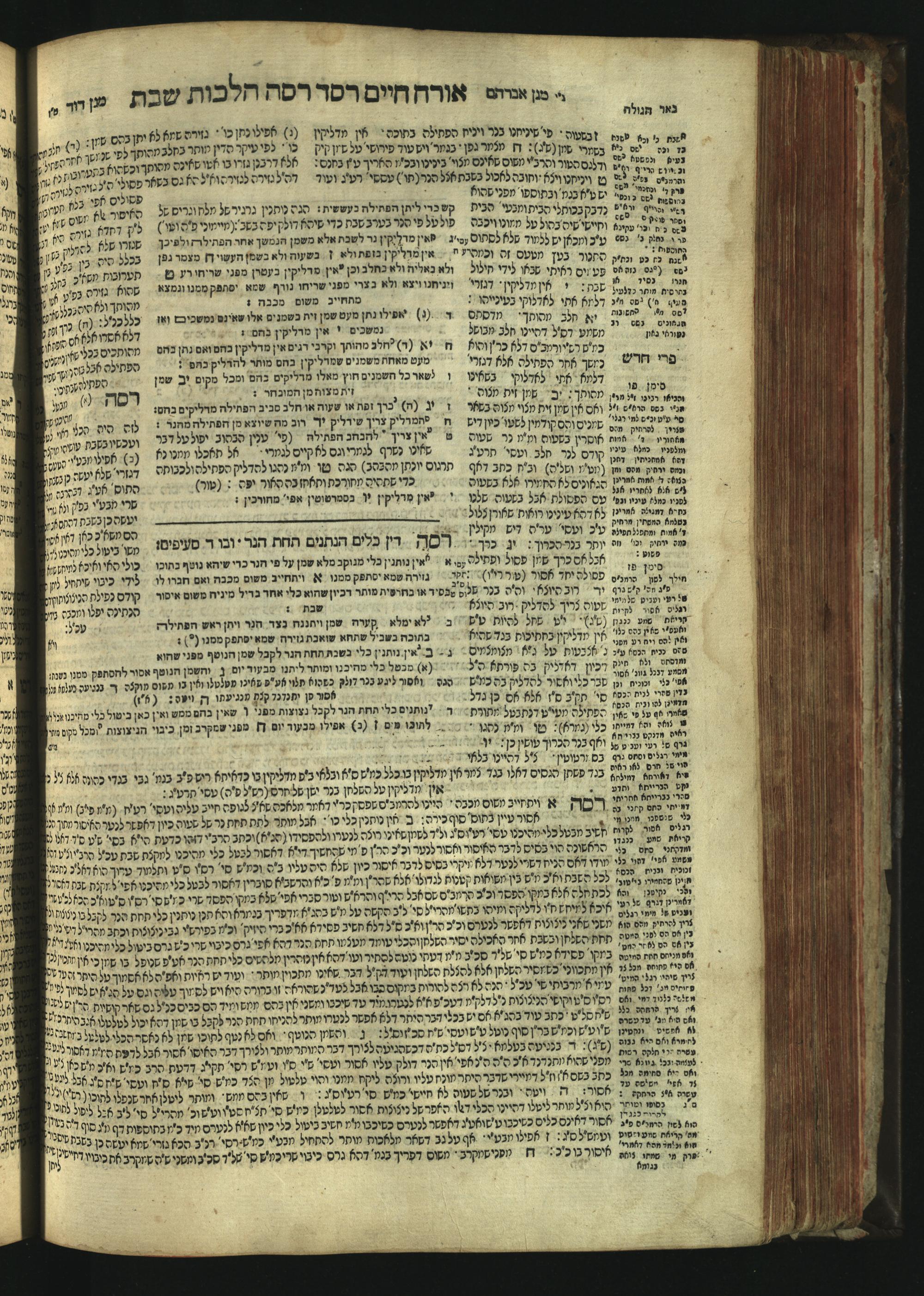 Sefer Magine erets : ... ʿal ha-Shulḥan ʿarukh ... Oraḥ ḥayim ... / ... ha-lo hemah ha-meʾorot ha-gedolim ... ha-shem ha-eḥad Magen Daṿid h.h. ha-gaʾon ... Daṿid ... baʿal ha-meḥaber sefer Ṭure zahav ṿe-shem ha-sheni Magen Avraham h.h. ... Avraham Segal Gumbiner z.l. dayan di-ḳ.ḳ. Ḳalish ... ṿe-ʿavar ʿalehem ʿAṭeret zeḳenim ... Mendel ... she-hirbits torato be-ḳ.ḳ. Ḳroṭoshin ben ha-katsin ... Zalman Fish Hoif mi-ḳ.ḳ. Ṿina: ... ha-ʿamadnu be-tsedo Beʾer ha-golah ... ṿe-hosafnu be-zeh ha-sefer ... Peri ḥadash ʿim ha-liḳuṭim ....ספר מגיני ארץ : ... על השלחן ערוך ... אורח חיים ... / ... הלא המה המאורות הגדולים ... השם האחד מגן דוד ... ה״ה הגאון ... דוד ... בעל המחבר ספר טורי זהב ושם השני מגן אברהם ה״ה ... אברהם סג״ל גומבינר ... דיין דק״ק קאליש ...ועבר עליהם עטרת זקנים ... מענדל ... שהרביץ תורתו בק״ק קראטשין בן הקצין ... זלמן פיש הויף מק״ק ווינא: העמדנו בצדו באר הגולה ... והוספנו בזה הספר ... פרי חדש עם הלקוטים ...