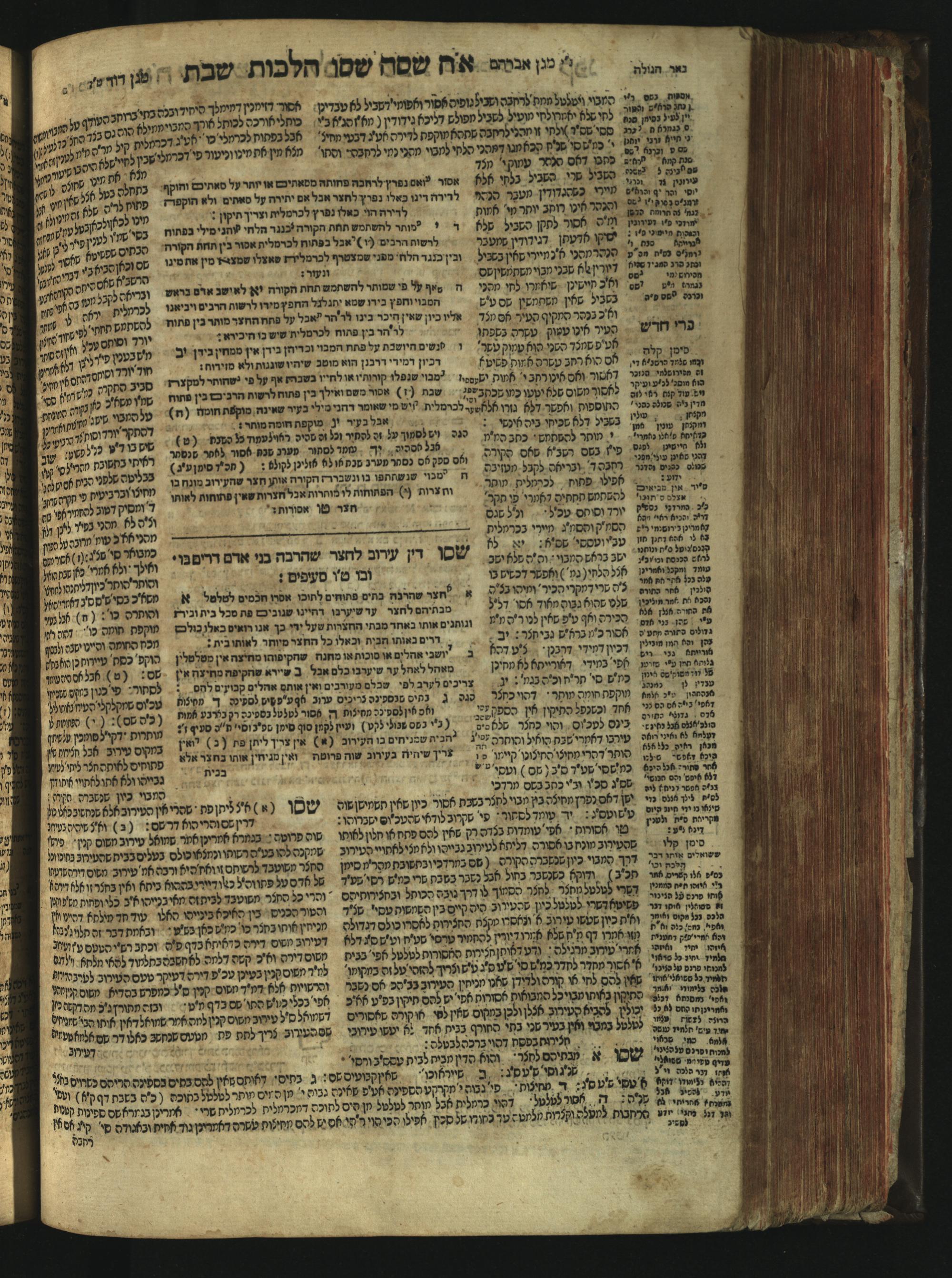 Sefer Magine erets : ... ʿal ha-Shulḥan ʿarukh ... Oraḥ ḥayim ... / ... ha-lo hemah ha-meʾorot ha-gedolim ... ha-shem ha-eḥad Magen Daṿid h.h. ha-gaʾon ... Daṿid ... baʿal ha-meḥaber sefer Ṭure zahav ṿe-shem ha-sheni Magen Avraham h.h. ... Avraham Segal Gumbiner z.l. dayan di-ḳ.ḳ. Ḳalish ... ṿe-ʿavar ʿalehem ʿAṭeret zeḳenim ... Mendel ... she-hirbits torato be-ḳ.ḳ. Ḳroṭoshin ben ha-katsin ... Zalman Fish Hoif mi-ḳ.ḳ. Ṿina: ... ha-ʿamadnu be-tsedo Beʾer ha-golah ... ṿe-hosafnu be-zeh ha-sefer ... Peri ḥadash ʿim ha-liḳuṭim ....ספר מגיני ארץ : ... על השלחן ערוך ... אורח חיים ... / ... הלא המה המאורות הגדולים ... השם האחד מגן דוד ... ה״ה הגאון ... דוד ... בעל המחבר ספר טורי זהב ושם השני מגן אברהם ה״ה ... אברהם סג״ל גומבינר ... דיין דק״ק קאליש ...ועבר עליהם עטרת זקנים ... מענדל ... שהרביץ תורתו בק״ק קראטשין בן הקצין ... זלמן פיש הויף מק״ק ווינא: העמדנו בצדו באר הגולה ... והוספנו בזה הספר ... פרי חדש עם הלקוטים ...