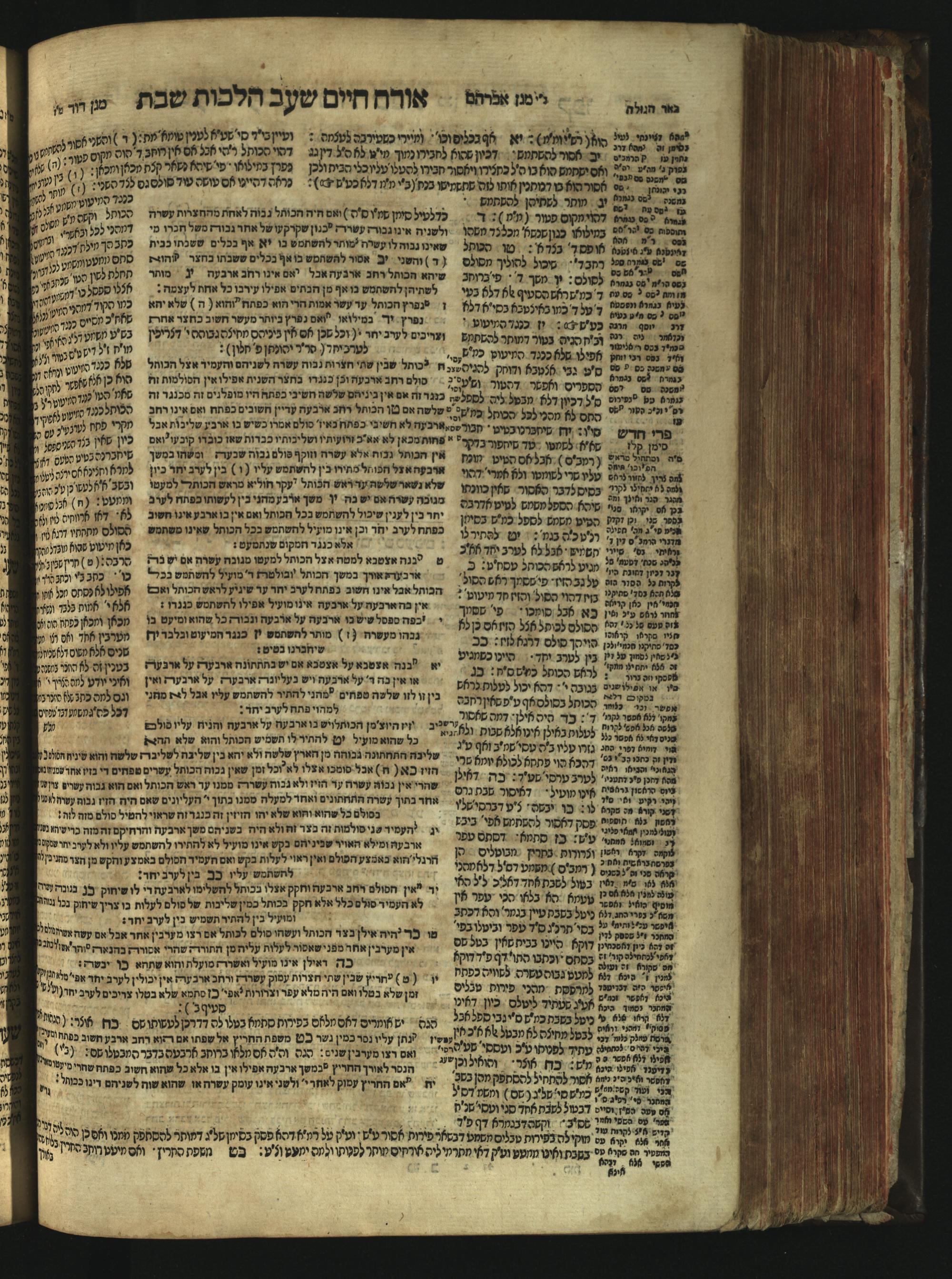 Sefer Magine erets : ... ʿal ha-Shulḥan ʿarukh ... Oraḥ ḥayim ... / ... ha-lo hemah ha-meʾorot ha-gedolim ... ha-shem ha-eḥad Magen Daṿid h.h. ha-gaʾon ... Daṿid ... baʿal ha-meḥaber sefer Ṭure zahav ṿe-shem ha-sheni Magen Avraham h.h. ... Avraham Segal Gumbiner z.l. dayan di-ḳ.ḳ. Ḳalish ... ṿe-ʿavar ʿalehem ʿAṭeret zeḳenim ... Mendel ... she-hirbits torato be-ḳ.ḳ. Ḳroṭoshin ben ha-katsin ... Zalman Fish Hoif mi-ḳ.ḳ. Ṿina: ... ha-ʿamadnu be-tsedo Beʾer ha-golah ... ṿe-hosafnu be-zeh ha-sefer ... Peri ḥadash ʿim ha-liḳuṭim ....ספר מגיני ארץ : ... על השלחן ערוך ... אורח חיים ... / ... הלא המה המאורות הגדולים ... השם האחד מגן דוד ... ה״ה הגאון ... דוד ... בעל המחבר ספר טורי זהב ושם השני מגן אברהם ה״ה ... אברהם סג״ל גומבינר ... דיין דק״ק קאליש ...ועבר עליהם עטרת זקנים ... מענדל ... שהרביץ תורתו בק״ק קראטשין בן הקצין ... זלמן פיש הויף מק״ק ווינא: העמדנו בצדו באר הגולה ... והוספנו בזה הספר ... פרי חדש עם הלקוטים ...