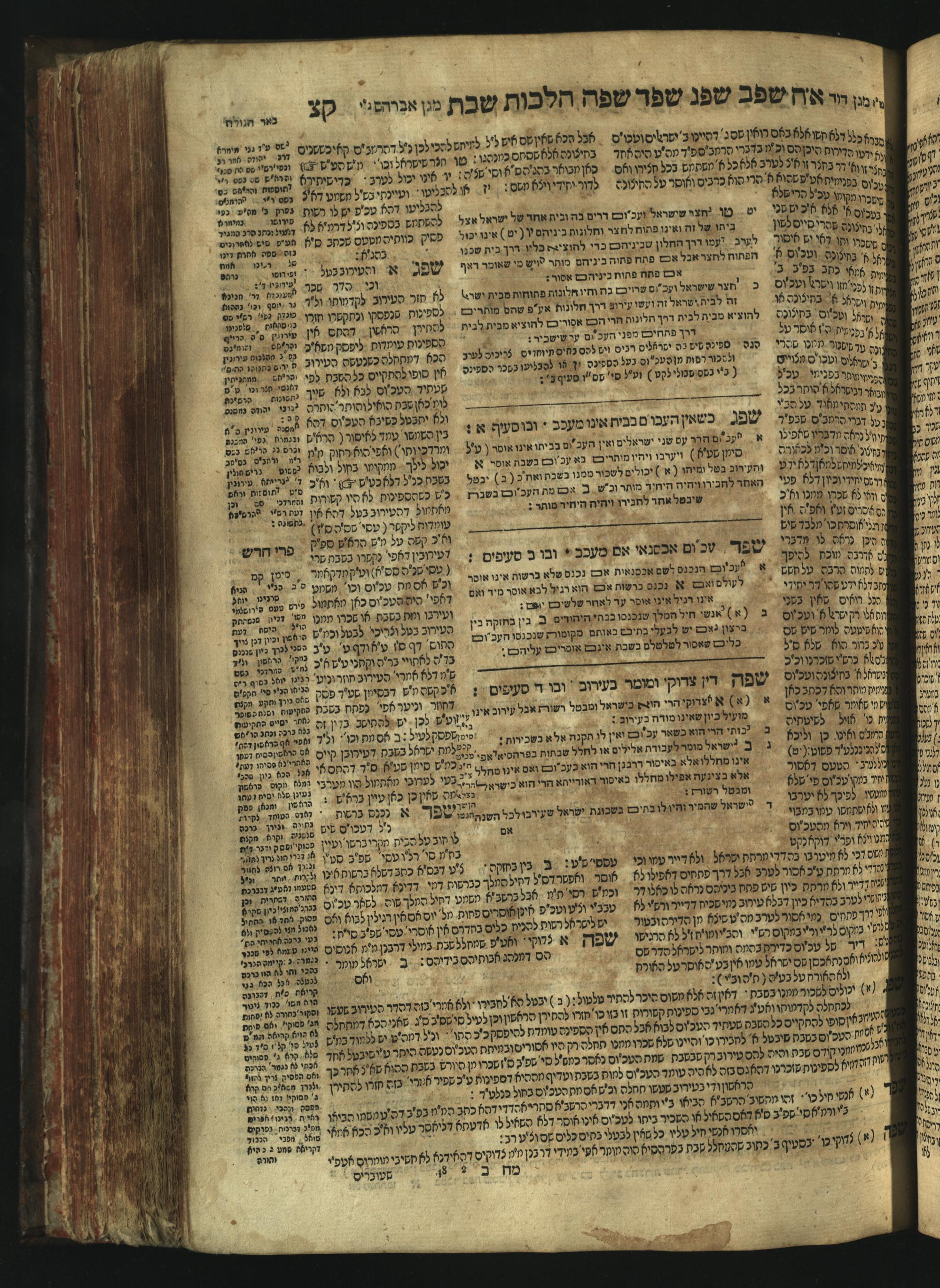 Sefer Magine erets : ... ʿal ha-Shulḥan ʿarukh ... Oraḥ ḥayim ... / ... ha-lo hemah ha-meʾorot ha-gedolim ... ha-shem ha-eḥad Magen Daṿid h.h. ha-gaʾon ... Daṿid ... baʿal ha-meḥaber sefer Ṭure zahav ṿe-shem ha-sheni Magen Avraham h.h. ... Avraham Segal Gumbiner z.l. dayan di-ḳ.ḳ. Ḳalish ... ṿe-ʿavar ʿalehem ʿAṭeret zeḳenim ... Mendel ... she-hirbits torato be-ḳ.ḳ. Ḳroṭoshin ben ha-katsin ... Zalman Fish Hoif mi-ḳ.ḳ. Ṿina: ... ha-ʿamadnu be-tsedo Beʾer ha-golah ... ṿe-hosafnu be-zeh ha-sefer ... Peri ḥadash ʿim ha-liḳuṭim ....ספר מגיני ארץ : ... על השלחן ערוך ... אורח חיים ... / ... הלא המה המאורות הגדולים ... השם האחד מגן דוד ... ה״ה הגאון ... דוד ... בעל המחבר ספר טורי זהב ושם השני מגן אברהם ה״ה ... אברהם סג״ל גומבינר ... דיין דק״ק קאליש ...ועבר עליהם עטרת זקנים ... מענדל ... שהרביץ תורתו בק״ק קראטשין בן הקצין ... זלמן פיש הויף מק״ק ווינא: העמדנו בצדו באר הגולה ... והוספנו בזה הספר ... פרי חדש עם הלקוטים ...