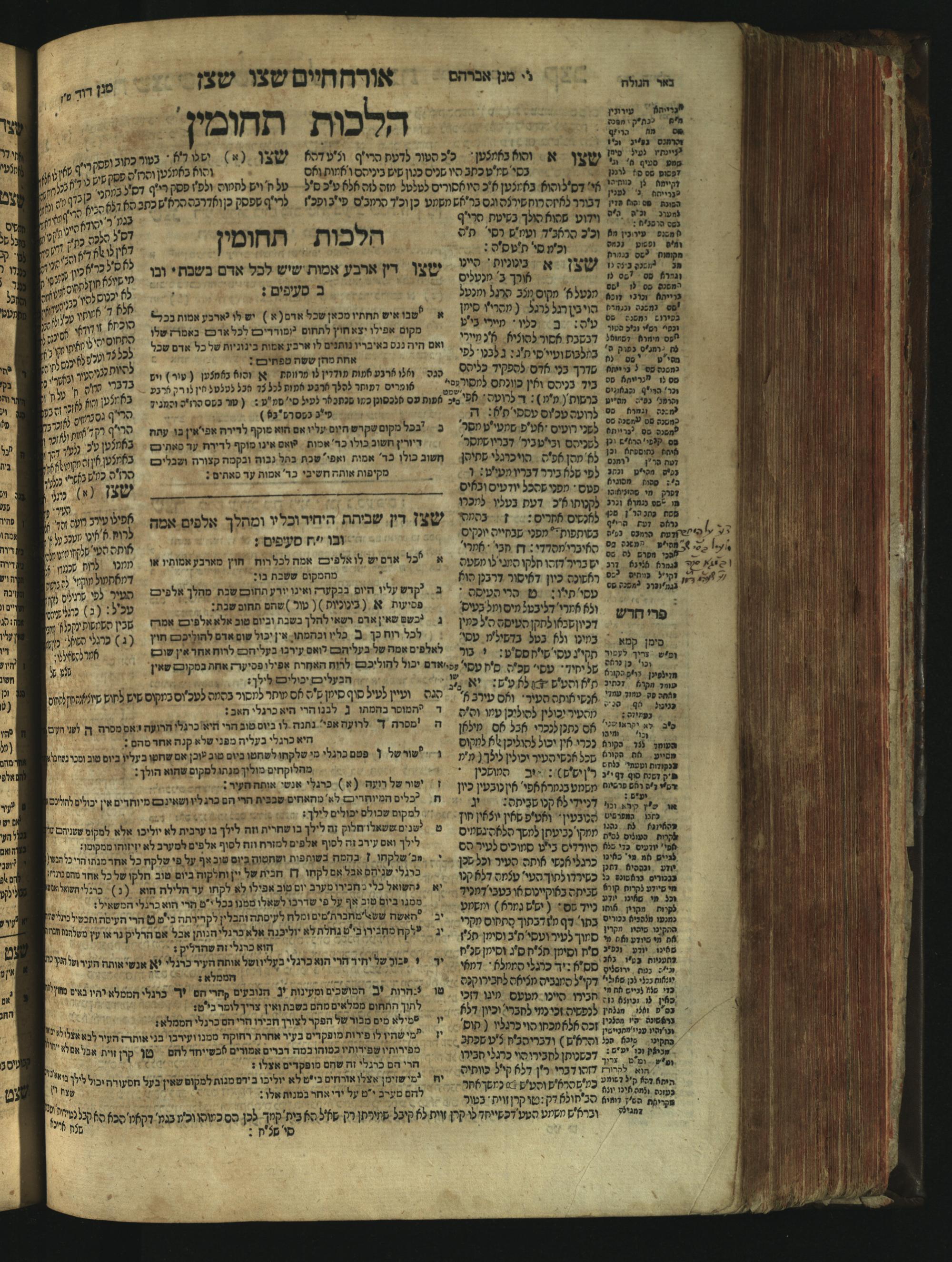 Sefer Magine erets : ... ʿal ha-Shulḥan ʿarukh ... Oraḥ ḥayim ... / ... ha-lo hemah ha-meʾorot ha-gedolim ... ha-shem ha-eḥad Magen Daṿid h.h. ha-gaʾon ... Daṿid ... baʿal ha-meḥaber sefer Ṭure zahav ṿe-shem ha-sheni Magen Avraham h.h. ... Avraham Segal Gumbiner z.l. dayan di-ḳ.ḳ. Ḳalish ... ṿe-ʿavar ʿalehem ʿAṭeret zeḳenim ... Mendel ... she-hirbits torato be-ḳ.ḳ. Ḳroṭoshin ben ha-katsin ... Zalman Fish Hoif mi-ḳ.ḳ. Ṿina: ... ha-ʿamadnu be-tsedo Beʾer ha-golah ... ṿe-hosafnu be-zeh ha-sefer ... Peri ḥadash ʿim ha-liḳuṭim ....ספר מגיני ארץ : ... על השלחן ערוך ... אורח חיים ... / ... הלא המה המאורות הגדולים ... השם האחד מגן דוד ... ה״ה הגאון ... דוד ... בעל המחבר ספר טורי זהב ושם השני מגן אברהם ה״ה ... אברהם סג״ל גומבינר ... דיין דק״ק קאליש ...ועבר עליהם עטרת זקנים ... מענדל ... שהרביץ תורתו בק״ק קראטשין בן הקצין ... זלמן פיש הויף מק״ק ווינא: העמדנו בצדו באר הגולה ... והוספנו בזה הספר ... פרי חדש עם הלקוטים ...