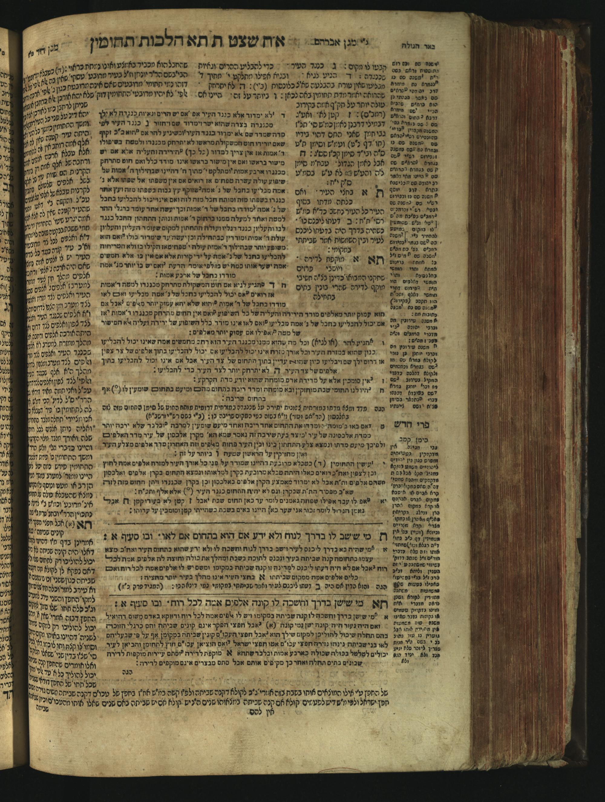 Sefer Magine erets : ... ʿal ha-Shulḥan ʿarukh ... Oraḥ ḥayim ... / ... ha-lo hemah ha-meʾorot ha-gedolim ... ha-shem ha-eḥad Magen Daṿid h.h. ha-gaʾon ... Daṿid ... baʿal ha-meḥaber sefer Ṭure zahav ṿe-shem ha-sheni Magen Avraham h.h. ... Avraham Segal Gumbiner z.l. dayan di-ḳ.ḳ. Ḳalish ... ṿe-ʿavar ʿalehem ʿAṭeret zeḳenim ... Mendel ... she-hirbits torato be-ḳ.ḳ. Ḳroṭoshin ben ha-katsin ... Zalman Fish Hoif mi-ḳ.ḳ. Ṿina: ... ha-ʿamadnu be-tsedo Beʾer ha-golah ... ṿe-hosafnu be-zeh ha-sefer ... Peri ḥadash ʿim ha-liḳuṭim ....ספר מגיני ארץ : ... על השלחן ערוך ... אורח חיים ... / ... הלא המה המאורות הגדולים ... השם האחד מגן דוד ... ה״ה הגאון ... דוד ... בעל המחבר ספר טורי זהב ושם השני מגן אברהם ה״ה ... אברהם סג״ל גומבינר ... דיין דק״ק קאליש ...ועבר עליהם עטרת זקנים ... מענדל ... שהרביץ תורתו בק״ק קראטשין בן הקצין ... זלמן פיש הויף מק״ק ווינא: העמדנו בצדו באר הגולה ... והוספנו בזה הספר ... פרי חדש עם הלקוטים ...