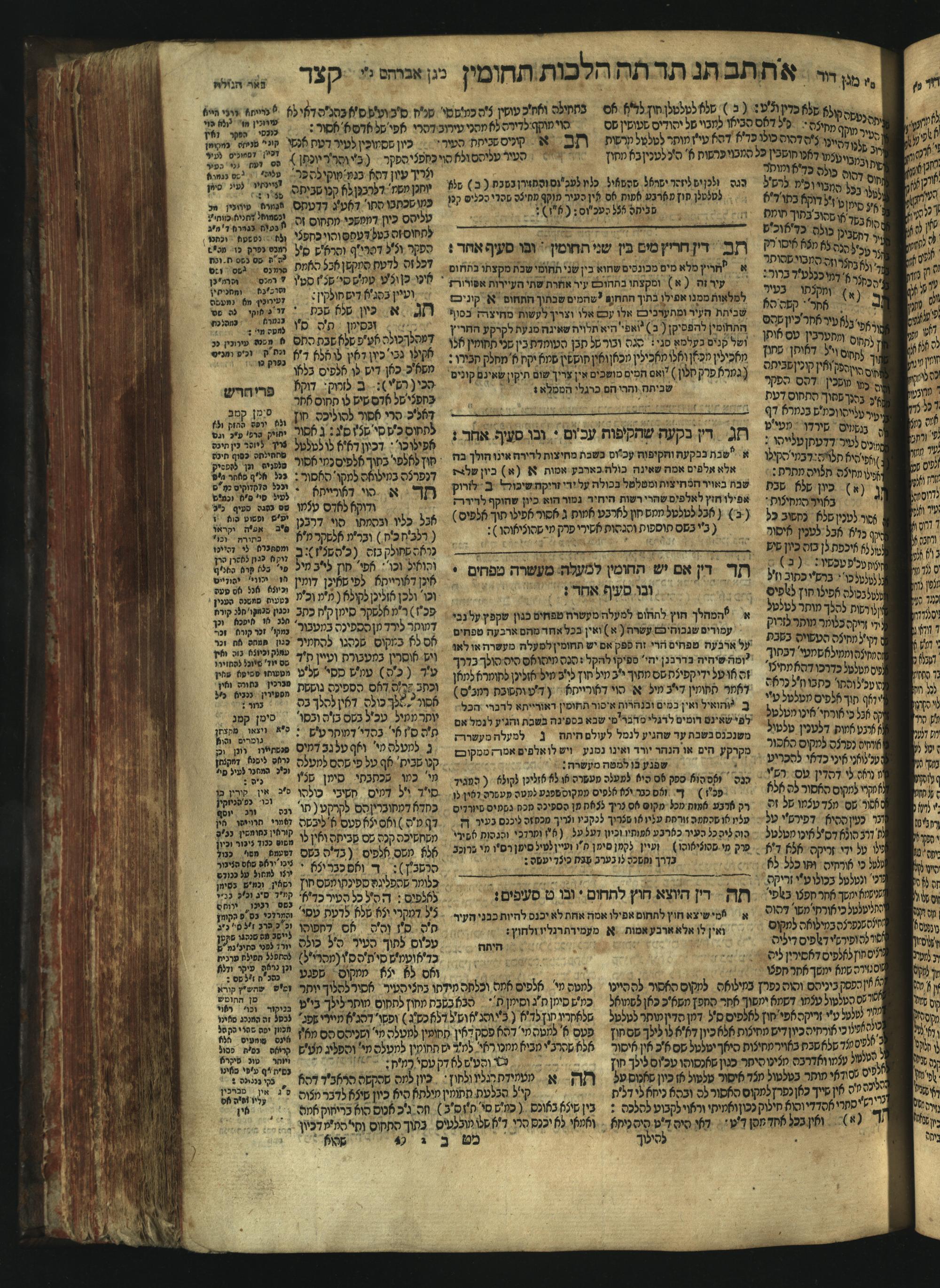 Sefer Magine erets : ... ʿal ha-Shulḥan ʿarukh ... Oraḥ ḥayim ... / ... ha-lo hemah ha-meʾorot ha-gedolim ... ha-shem ha-eḥad Magen Daṿid h.h. ha-gaʾon ... Daṿid ... baʿal ha-meḥaber sefer Ṭure zahav ṿe-shem ha-sheni Magen Avraham h.h. ... Avraham Segal Gumbiner z.l. dayan di-ḳ.ḳ. Ḳalish ... ṿe-ʿavar ʿalehem ʿAṭeret zeḳenim ... Mendel ... she-hirbits torato be-ḳ.ḳ. Ḳroṭoshin ben ha-katsin ... Zalman Fish Hoif mi-ḳ.ḳ. Ṿina: ... ha-ʿamadnu be-tsedo Beʾer ha-golah ... ṿe-hosafnu be-zeh ha-sefer ... Peri ḥadash ʿim ha-liḳuṭim ....ספר מגיני ארץ : ... על השלחן ערוך ... אורח חיים ... / ... הלא המה המאורות הגדולים ... השם האחד מגן דוד ... ה״ה הגאון ... דוד ... בעל המחבר ספר טורי זהב ושם השני מגן אברהם ה״ה ... אברהם סג״ל גומבינר ... דיין דק״ק קאליש ...ועבר עליהם עטרת זקנים ... מענדל ... שהרביץ תורתו בק״ק קראטשין בן הקצין ... זלמן פיש הויף מק״ק ווינא: העמדנו בצדו באר הגולה ... והוספנו בזה הספר ... פרי חדש עם הלקוטים ...