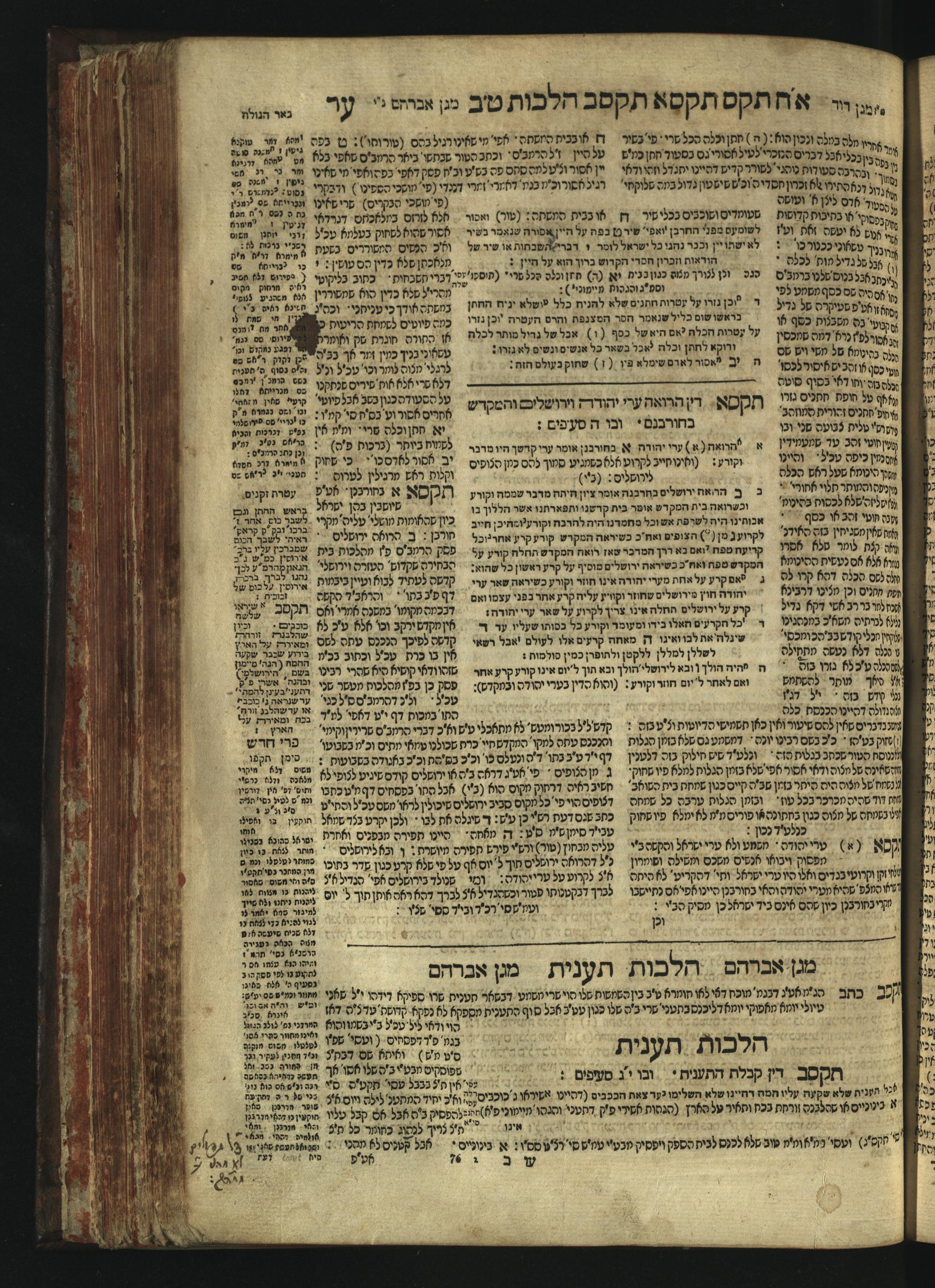 Sefer Magine erets : ... ʿal ha-Shulḥan ʿarukh ... Oraḥ ḥayim ... / ... ha-lo hemah ha-meʾorot ha-gedolim ... ha-shem ha-eḥad Magen Daṿid h.h. ha-gaʾon ... Daṿid ... baʿal ha-meḥaber sefer Ṭure zahav ṿe-shem ha-sheni Magen Avraham h.h. ... Avraham Segal Gumbiner z.l. dayan di-ḳ.ḳ. Ḳalish ... ṿe-ʿavar ʿalehem ʿAṭeret zeḳenim ... Mendel ... she-hirbits torato be-ḳ.ḳ. Ḳroṭoshin ben ha-katsin ... Zalman Fish Hoif mi-ḳ.ḳ. Ṿina: ... ha-ʿamadnu be-tsedo Beʾer ha-golah ... ṿe-hosafnu be-zeh ha-sefer ... Peri ḥadash ʿim ha-liḳuṭim ....ספר מגיני ארץ : ... על השלחן ערוך ... אורח חיים ... / ... הלא המה המאורות הגדולים ... השם האחד מגן דוד ... ה״ה הגאון ... דוד ... בעל המחבר ספר טורי זהב ושם השני מגן אברהם ה״ה ... אברהם סג״ל גומבינר ... דיין דק״ק קאליש ...ועבר עליהם עטרת זקנים ... מענדל ... שהרביץ תורתו בק״ק קראטשין בן הקצין ... זלמן פיש הויף מק״ק ווינא: העמדנו בצדו באר הגולה ... והוספנו בזה הספר ... פרי חדש עם הלקוטים ...