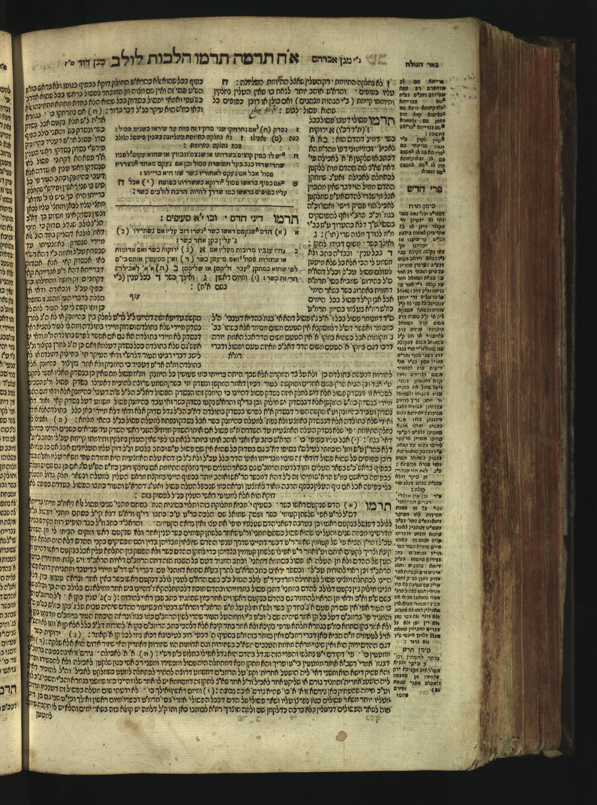Sefer Magine erets : ... ʿal ha-Shulḥan ʿarukh ... Oraḥ ḥayim ... / ... ha-lo hemah ha-meʾorot ha-gedolim ... ha-shem ha-eḥad Magen Daṿid h.h. ha-gaʾon ... Daṿid ... baʿal ha-meḥaber sefer Ṭure zahav ṿe-shem ha-sheni Magen Avraham h.h. ... Avraham Segal Gumbiner z.l. dayan di-ḳ.ḳ. Ḳalish ... ṿe-ʿavar ʿalehem ʿAṭeret zeḳenim ... Mendel ... she-hirbits torato be-ḳ.ḳ. Ḳroṭoshin ben ha-katsin ... Zalman Fish Hoif mi-ḳ.ḳ. Ṿina: ... ha-ʿamadnu be-tsedo Beʾer ha-golah ... ṿe-hosafnu be-zeh ha-sefer ... Peri ḥadash ʿim ha-liḳuṭim ....ספר מגיני ארץ : ... על השלחן ערוך ... אורח חיים ... / ... הלא המה המאורות הגדולים ... השם האחד מגן דוד ... ה״ה הגאון ... דוד ... בעל המחבר ספר טורי זהב ושם השני מגן אברהם ה״ה ... אברהם סג״ל גומבינר ... דיין דק״ק קאליש ...ועבר עליהם עטרת זקנים ... מענדל ... שהרביץ תורתו בק״ק קראטשין בן הקצין ... זלמן פיש הויף מק״ק ווינא: העמדנו בצדו באר הגולה ... והוספנו בזה הספר ... פרי חדש עם הלקוטים ...