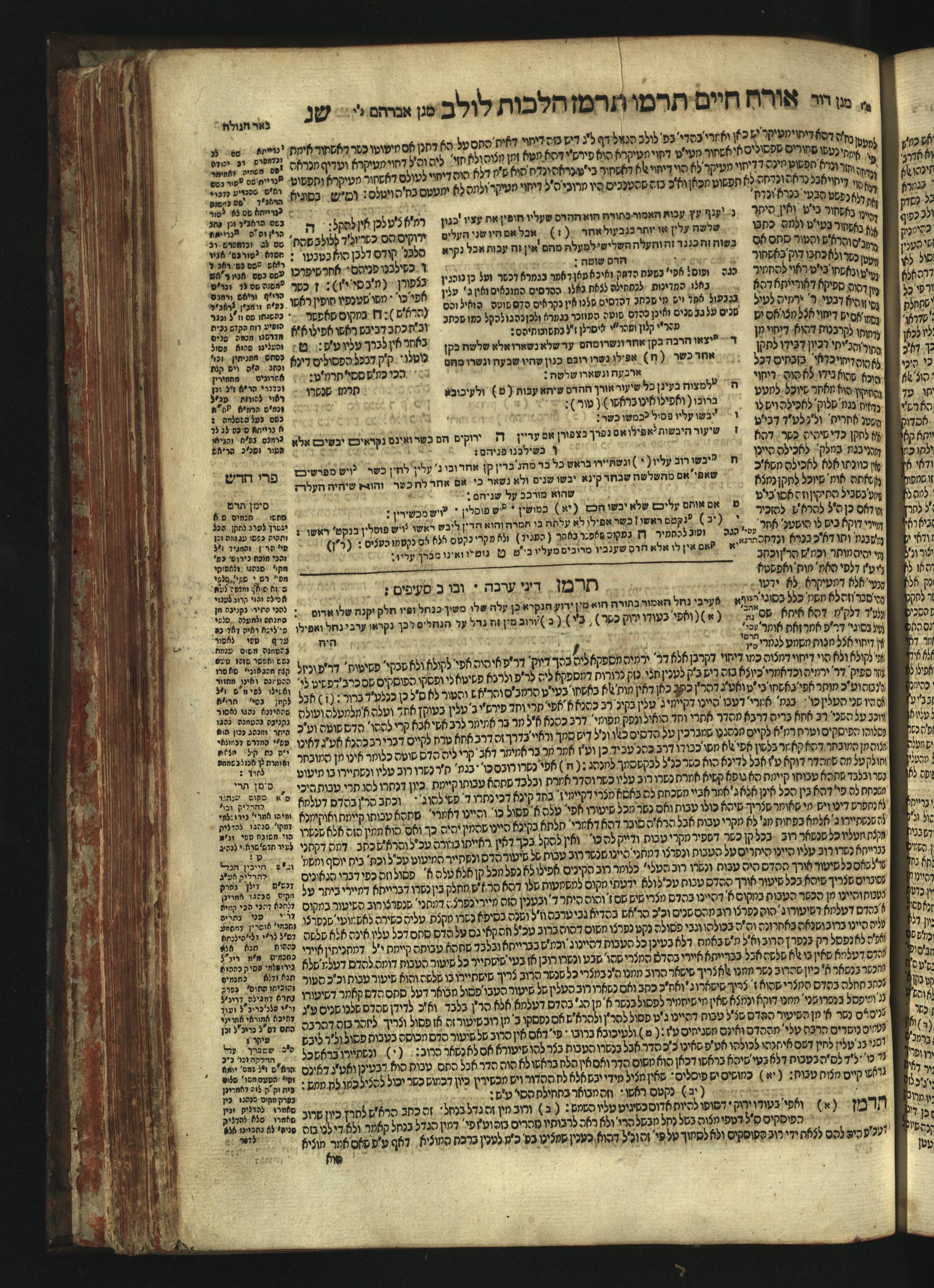 Sefer Magine erets : ... ʿal ha-Shulḥan ʿarukh ... Oraḥ ḥayim ... / ... ha-lo hemah ha-meʾorot ha-gedolim ... ha-shem ha-eḥad Magen Daṿid h.h. ha-gaʾon ... Daṿid ... baʿal ha-meḥaber sefer Ṭure zahav ṿe-shem ha-sheni Magen Avraham h.h. ... Avraham Segal Gumbiner z.l. dayan di-ḳ.ḳ. Ḳalish ... ṿe-ʿavar ʿalehem ʿAṭeret zeḳenim ... Mendel ... she-hirbits torato be-ḳ.ḳ. Ḳroṭoshin ben ha-katsin ... Zalman Fish Hoif mi-ḳ.ḳ. Ṿina: ... ha-ʿamadnu be-tsedo Beʾer ha-golah ... ṿe-hosafnu be-zeh ha-sefer ... Peri ḥadash ʿim ha-liḳuṭim ....ספר מגיני ארץ : ... על השלחן ערוך ... אורח חיים ... / ... הלא המה המאורות הגדולים ... השם האחד מגן דוד ... ה״ה הגאון ... דוד ... בעל המחבר ספר טורי זהב ושם השני מגן אברהם ה״ה ... אברהם סג״ל גומבינר ... דיין דק״ק קאליש ...ועבר עליהם עטרת זקנים ... מענדל ... שהרביץ תורתו בק״ק קראטשין בן הקצין ... זלמן פיש הויף מק״ק ווינא: העמדנו בצדו באר הגולה ... והוספנו בזה הספר ... פרי חדש עם הלקוטים ...