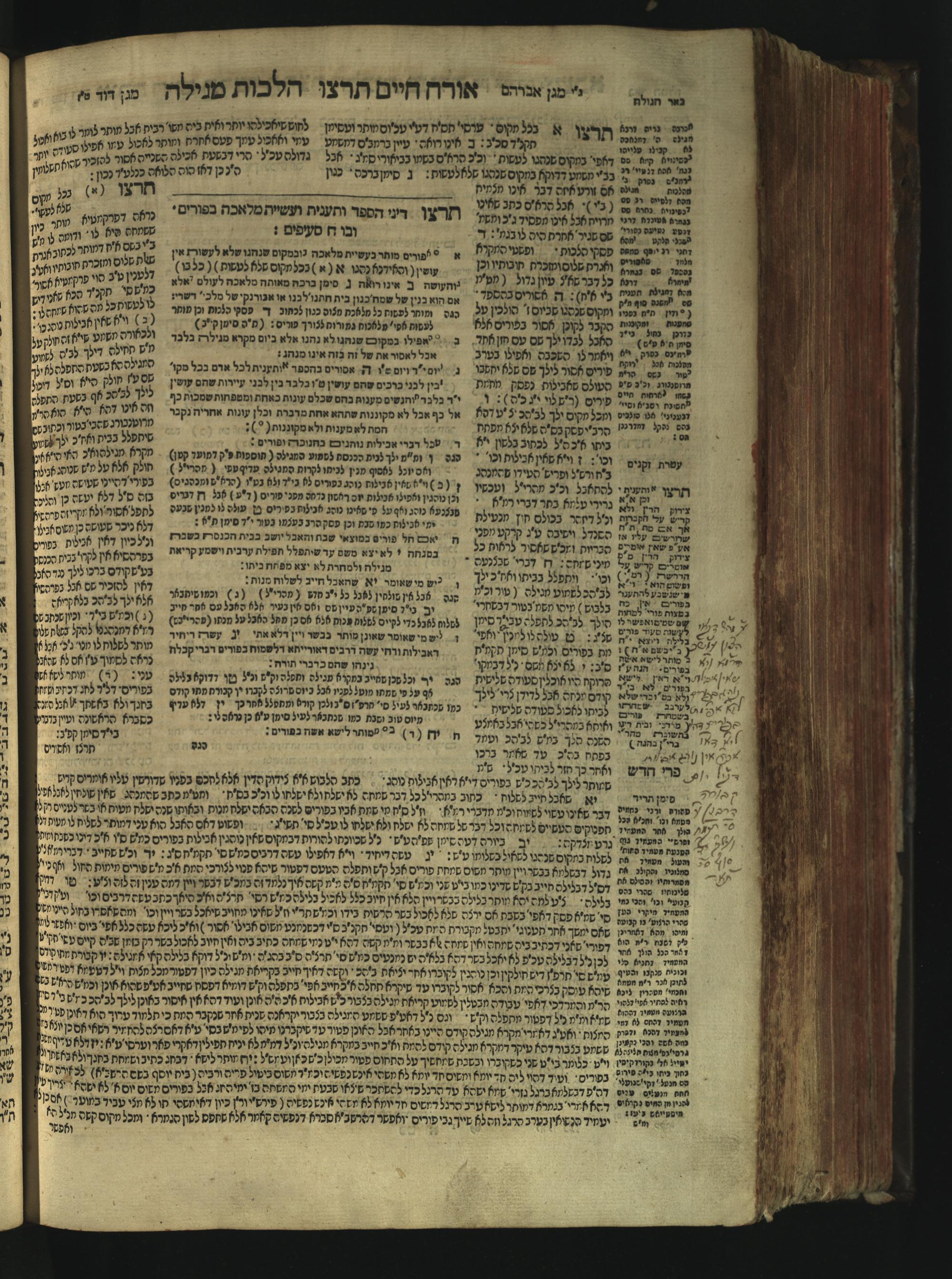 Sefer Magine erets : ... ʿal ha-Shulḥan ʿarukh ... Oraḥ ḥayim ... / ... ha-lo hemah ha-meʾorot ha-gedolim ... ha-shem ha-eḥad Magen Daṿid h.h. ha-gaʾon ... Daṿid ... baʿal ha-meḥaber sefer Ṭure zahav ṿe-shem ha-sheni Magen Avraham h.h. ... Avraham Segal Gumbiner z.l. dayan di-ḳ.ḳ. Ḳalish ... ṿe-ʿavar ʿalehem ʿAṭeret zeḳenim ... Mendel ... she-hirbits torato be-ḳ.ḳ. Ḳroṭoshin ben ha-katsin ... Zalman Fish Hoif mi-ḳ.ḳ. Ṿina: ... ha-ʿamadnu be-tsedo Beʾer ha-golah ... ṿe-hosafnu be-zeh ha-sefer ... Peri ḥadash ʿim ha-liḳuṭim ....ספר מגיני ארץ : ... על השלחן ערוך ... אורח חיים ... / ... הלא המה המאורות הגדולים ... השם האחד מגן דוד ... ה״ה הגאון ... דוד ... בעל המחבר ספר טורי זהב ושם השני מגן אברהם ה״ה ... אברהם סג״ל גומבינר ... דיין דק״ק קאליש ...ועבר עליהם עטרת זקנים ... מענדל ... שהרביץ תורתו בק״ק קראטשין בן הקצין ... זלמן פיש הויף מק״ק ווינא: העמדנו בצדו באר הגולה ... והוספנו בזה הספר ... פרי חדש עם הלקוטים ...