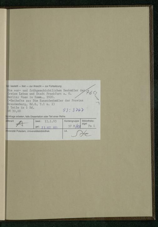 Bd. 6, Teil 1, Beih. (1920) Die vor- und frühgeschichtlichen Denkmäler des Kreises Lebus / unter der Schriftl. des Erich Blunck bearb. von Alfred Götze