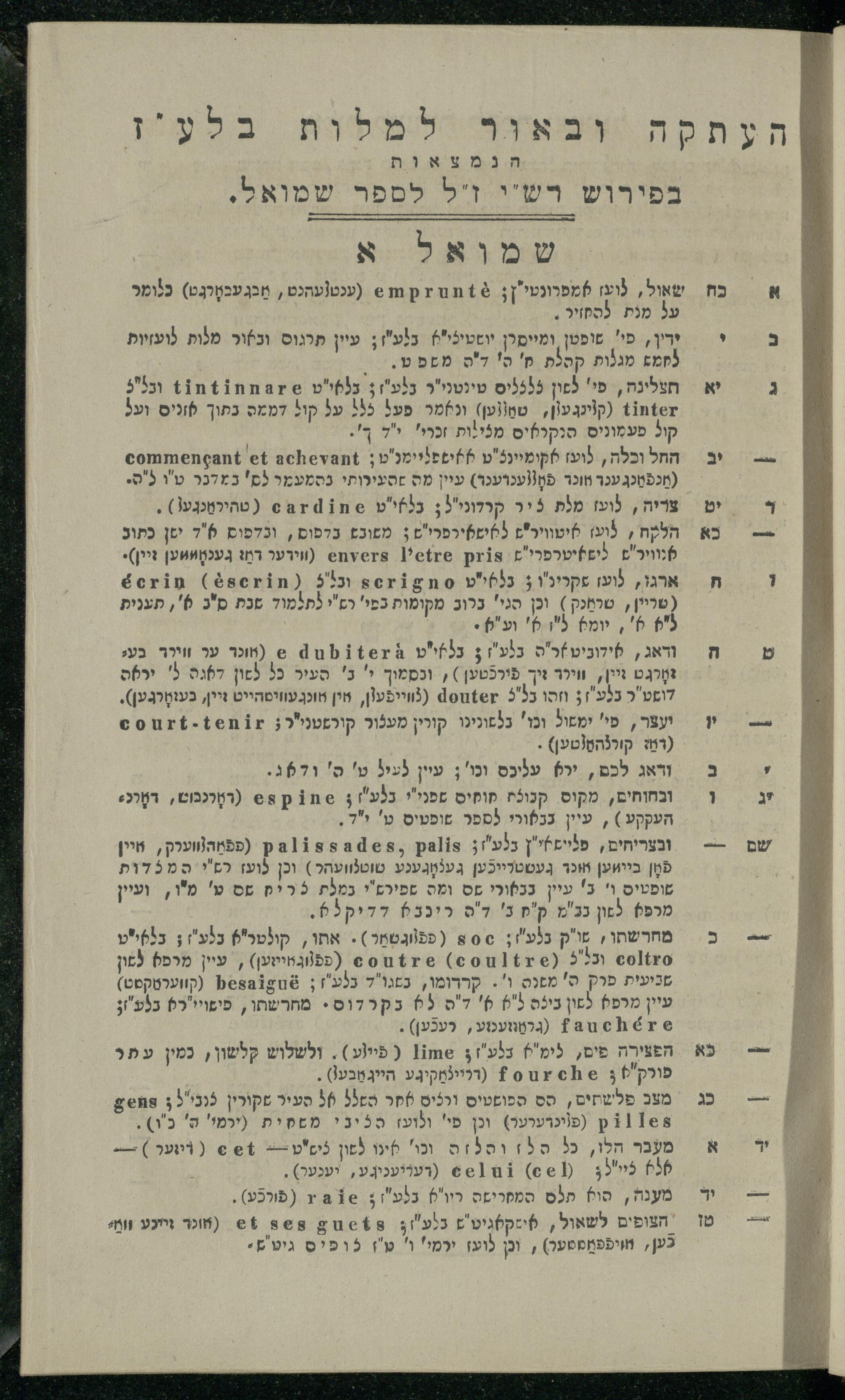 7 (1835) Sefer Shemuʾel / meturgam u-mevoʾar me-ḥadash, hugah be-viḳoret ʿain ha-medaḳdeḳ ha-ḥakham mo.h.r.R. Ṿolf Meʾir (moreh lashon ʿIvri be-vet ḥinukh ha-normali asher be-Prag) ṿe-nilṿah elaṿ Perush Rashi ṿe-haʿtaḳat u-veʾur kol milot be-laʿaz me-et ha-madpis Mosheh ha-Leṿi Landa7 (1835) ספר שמואל / מתורגם ומבואר מחדש, הוגה בבקרת עין המדקדק החכם מוהר''ר וואלף מאיר (מורה לשון עברי בבית חנוך הנארמאלי אשר בפראג) ונלוה אליו פירוש רש''י והעתקת ובאור כל מלות בלע''ז מאת המדפיס משה הלוי לנדא