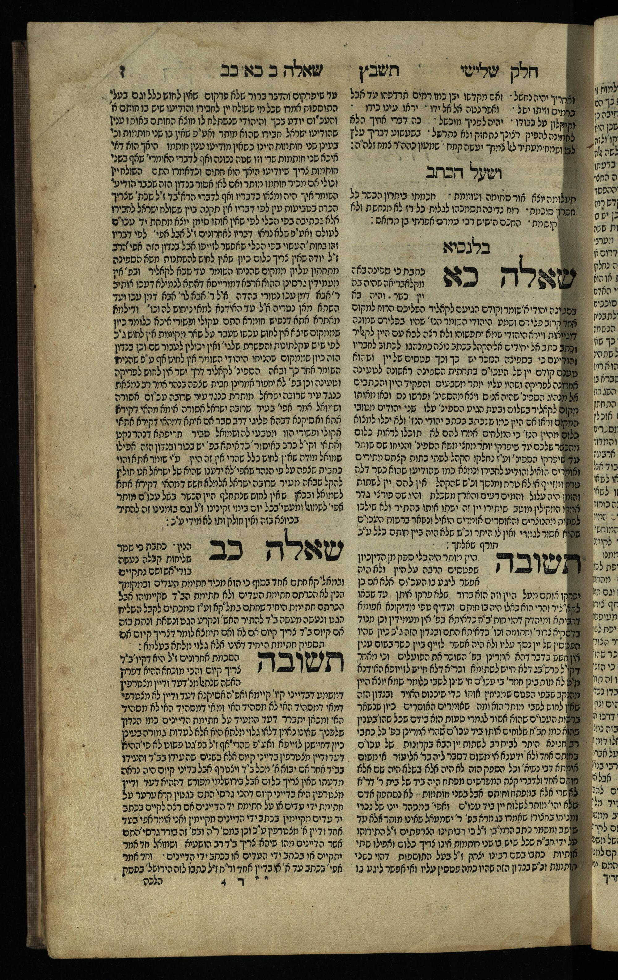 Ḥeleḳ reviʿi, ha-Ṭur ha-shelishi (1738) Ḥuṭ ha-meshulash / she-ḥiber ... Avraham ibn Ṭaṿah ... gam elu teshuvoto she-ḥiber be-koaḥ ḥokhmato ... gam hem ... ganuzim u-nishmarim ʿad ha-yom she-naʿaśu ḥeleḳ reviʿi le-sefer ha-Tashbets ... ṿe-ha-yom ha-zeh nitgalgel ha-zekhut ʿal yede ... Meʾir Ḳreśḳaś ... ben ... Netanʾel ...Ḥeleḳ reviʿi, ha-Ṭur ha-shelishi (1738) חוט המשולש / שחבר ... אברהם אבן טוואה ... גם אלו תשובותו שחבר בכח חכמתו ... גם הם ... גנוזים ונשמרים עד היום שנעשו חלק רביעי לספר התשבץ ...והיום הזה נתגלגל הזכות על ידי ... מאיר קרשקש ... בן ... נתנאל ...