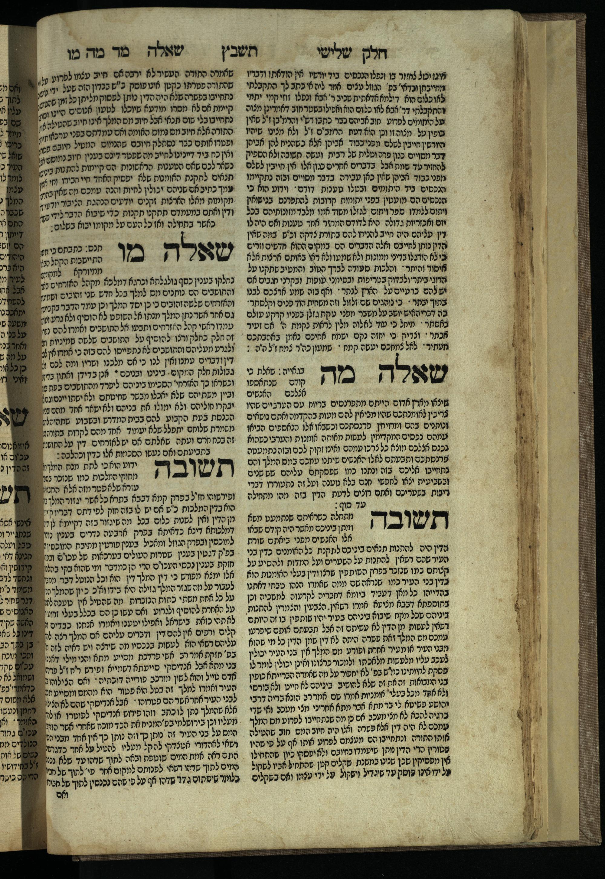 Ḥeleḳ reviʿi, ha-Ṭur ha-shelishi (1738) Ḥuṭ ha-meshulash / she-ḥiber ... Avraham ibn Ṭaṿah ... gam elu teshuvoto she-ḥiber be-koaḥ ḥokhmato ... gam hem ... ganuzim u-nishmarim ʿad ha-yom she-naʿaśu ḥeleḳ reviʿi le-sefer ha-Tashbets ... ṿe-ha-yom ha-zeh nitgalgel ha-zekhut ʿal yede ... Meʾir Ḳreśḳaś ... ben ... Netanʾel ...Ḥeleḳ reviʿi, ha-Ṭur ha-shelishi (1738) חוט המשולש / שחבר ... אברהם אבן טוואה ... גם אלו תשובותו שחבר בכח חכמתו ... גם הם ... גנוזים ונשמרים עד היום שנעשו חלק רביעי לספר התשבץ ...והיום הזה נתגלגל הזכות על ידי ... מאיר קרשקש ... בן ... נתנאל ...