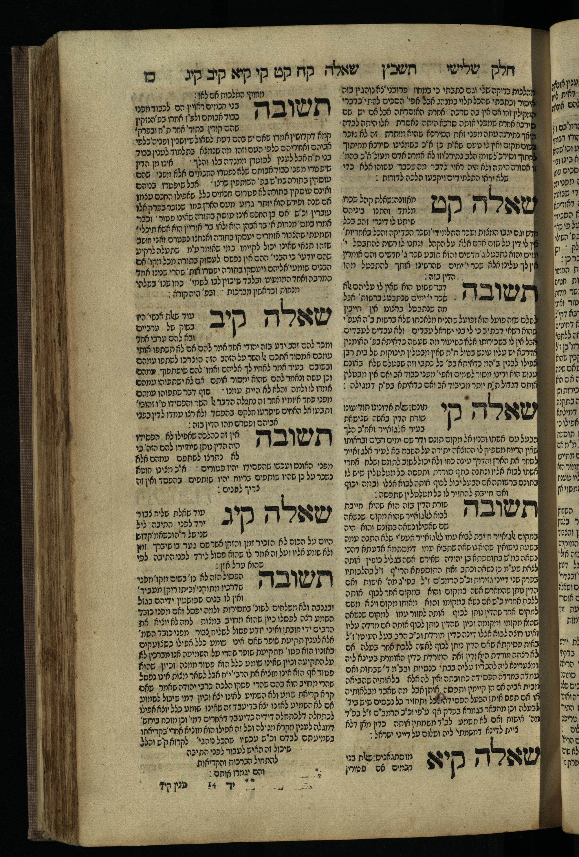 Ḥeleḳ reviʿi, ha-Ṭur ha-shelishi (1738) Ḥuṭ ha-meshulash / she-ḥiber ... Avraham ibn Ṭaṿah ... gam elu teshuvoto she-ḥiber be-koaḥ ḥokhmato ... gam hem ... ganuzim u-nishmarim ʿad ha-yom she-naʿaśu ḥeleḳ reviʿi le-sefer ha-Tashbets ... ṿe-ha-yom ha-zeh nitgalgel ha-zekhut ʿal yede ... Meʾir Ḳreśḳaś ... ben ... Netanʾel ...Ḥeleḳ reviʿi, ha-Ṭur ha-shelishi (1738) חוט המשולש / שחבר ... אברהם אבן טוואה ... גם אלו תשובותו שחבר בכח חכמתו ... גם הם ... גנוזים ונשמרים עד היום שנעשו חלק רביעי לספר התשבץ ...והיום הזה נתגלגל הזכות על ידי ... מאיר קרשקש ... בן ... נתנאל ...