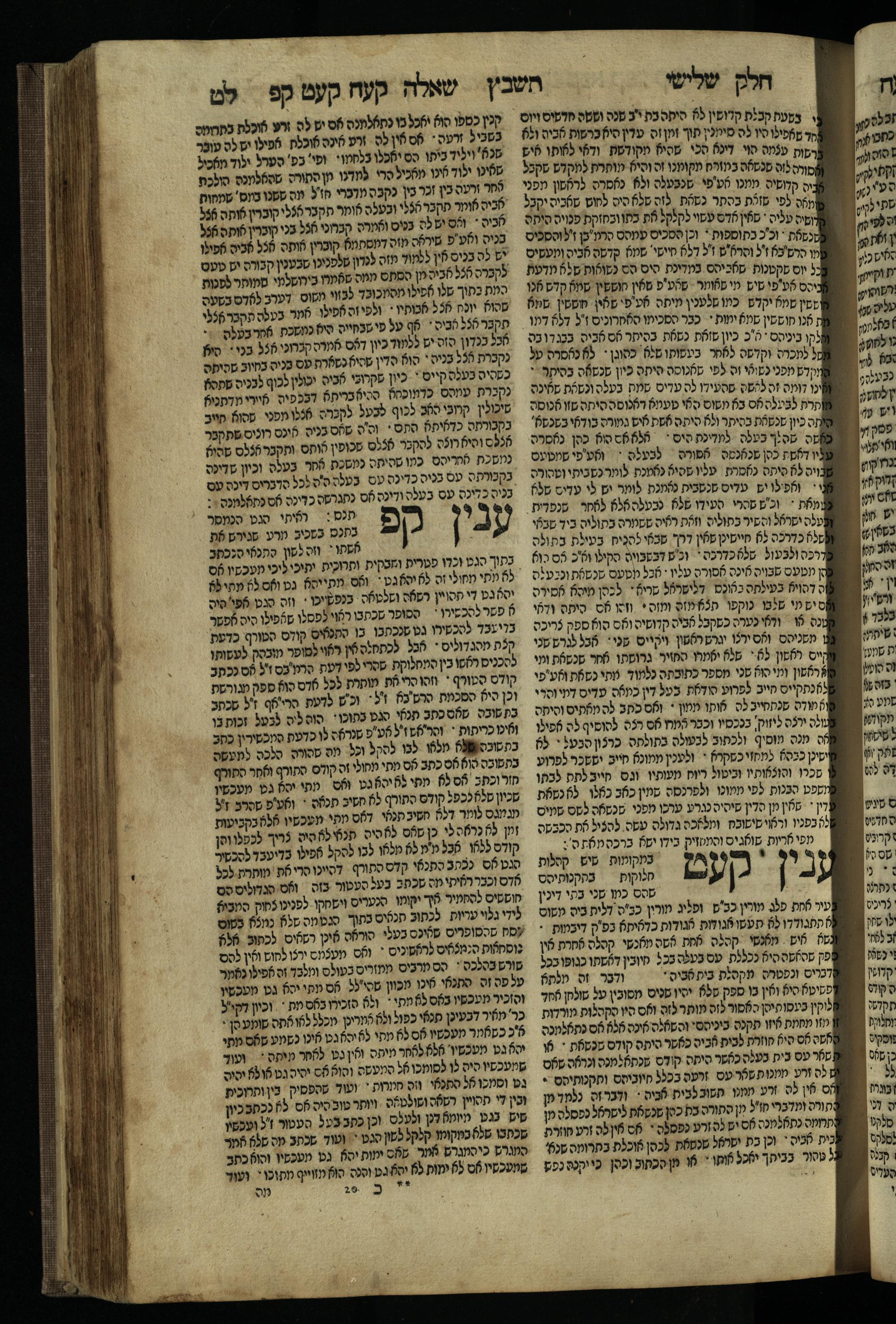 Ḥeleḳ reviʿi, ha-Ṭur ha-shelishi (1738) Ḥuṭ ha-meshulash / she-ḥiber ... Avraham ibn Ṭaṿah ... gam elu teshuvoto she-ḥiber be-koaḥ ḥokhmato ... gam hem ... ganuzim u-nishmarim ʿad ha-yom she-naʿaśu ḥeleḳ reviʿi le-sefer ha-Tashbets ... ṿe-ha-yom ha-zeh nitgalgel ha-zekhut ʿal yede ... Meʾir Ḳreśḳaś ... ben ... Netanʾel ...Ḥeleḳ reviʿi, ha-Ṭur ha-shelishi (1738) חוט המשולש / שחבר ... אברהם אבן טוואה ... גם אלו תשובותו שחבר בכח חכמתו ... גם הם ... גנוזים ונשמרים עד היום שנעשו חלק רביעי לספר התשבץ ...והיום הזה נתגלגל הזכות על ידי ... מאיר קרשקש ... בן ... נתנאל ...