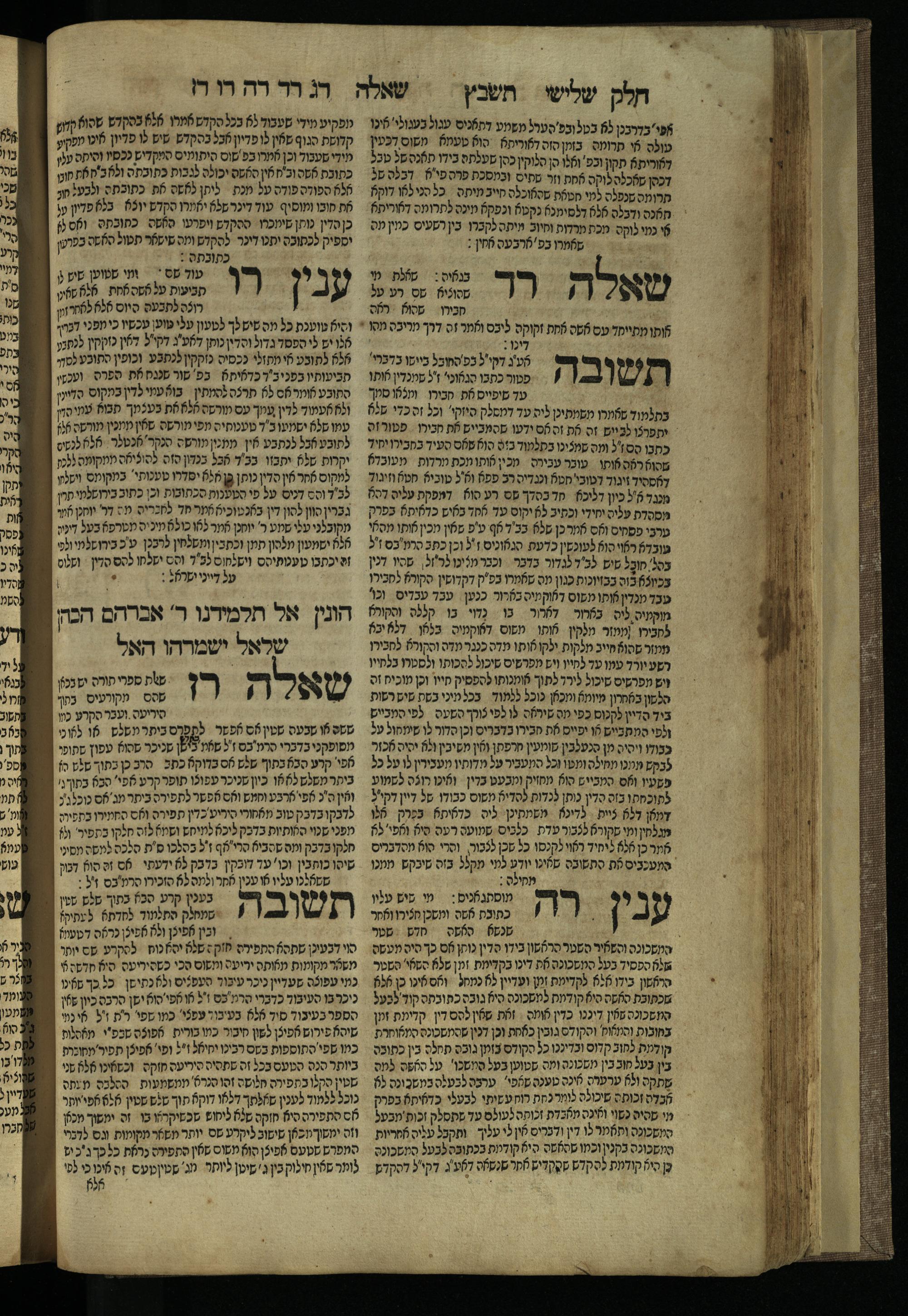 Ḥeleḳ reviʿi, ha-Ṭur ha-shelishi (1738) Ḥuṭ ha-meshulash / she-ḥiber ... Avraham ibn Ṭaṿah ... gam elu teshuvoto she-ḥiber be-koaḥ ḥokhmato ... gam hem ... ganuzim u-nishmarim ʿad ha-yom she-naʿaśu ḥeleḳ reviʿi le-sefer ha-Tashbets ... ṿe-ha-yom ha-zeh nitgalgel ha-zekhut ʿal yede ... Meʾir Ḳreśḳaś ... ben ... Netanʾel ...Ḥeleḳ reviʿi, ha-Ṭur ha-shelishi (1738) חוט המשולש / שחבר ... אברהם אבן טוואה ... גם אלו תשובותו שחבר בכח חכמתו ... גם הם ... גנוזים ונשמרים עד היום שנעשו חלק רביעי לספר התשבץ ...והיום הזה נתגלגל הזכות על ידי ... מאיר קרשקש ... בן ... נתנאל ...